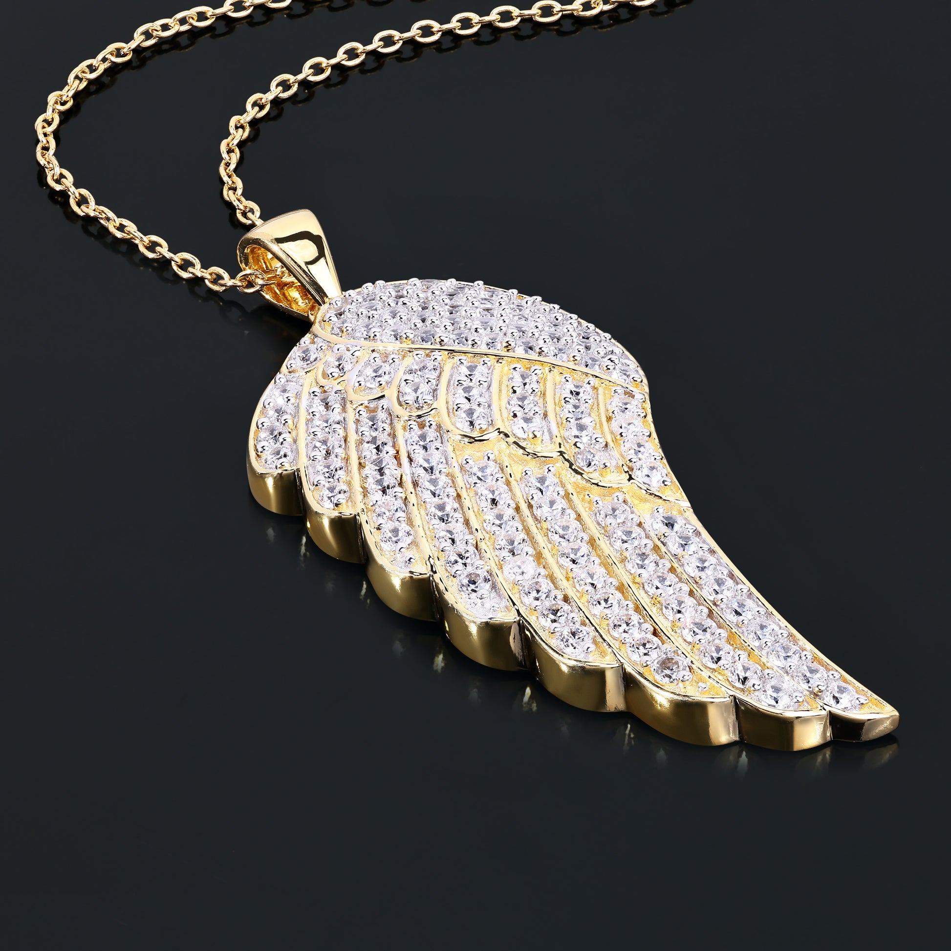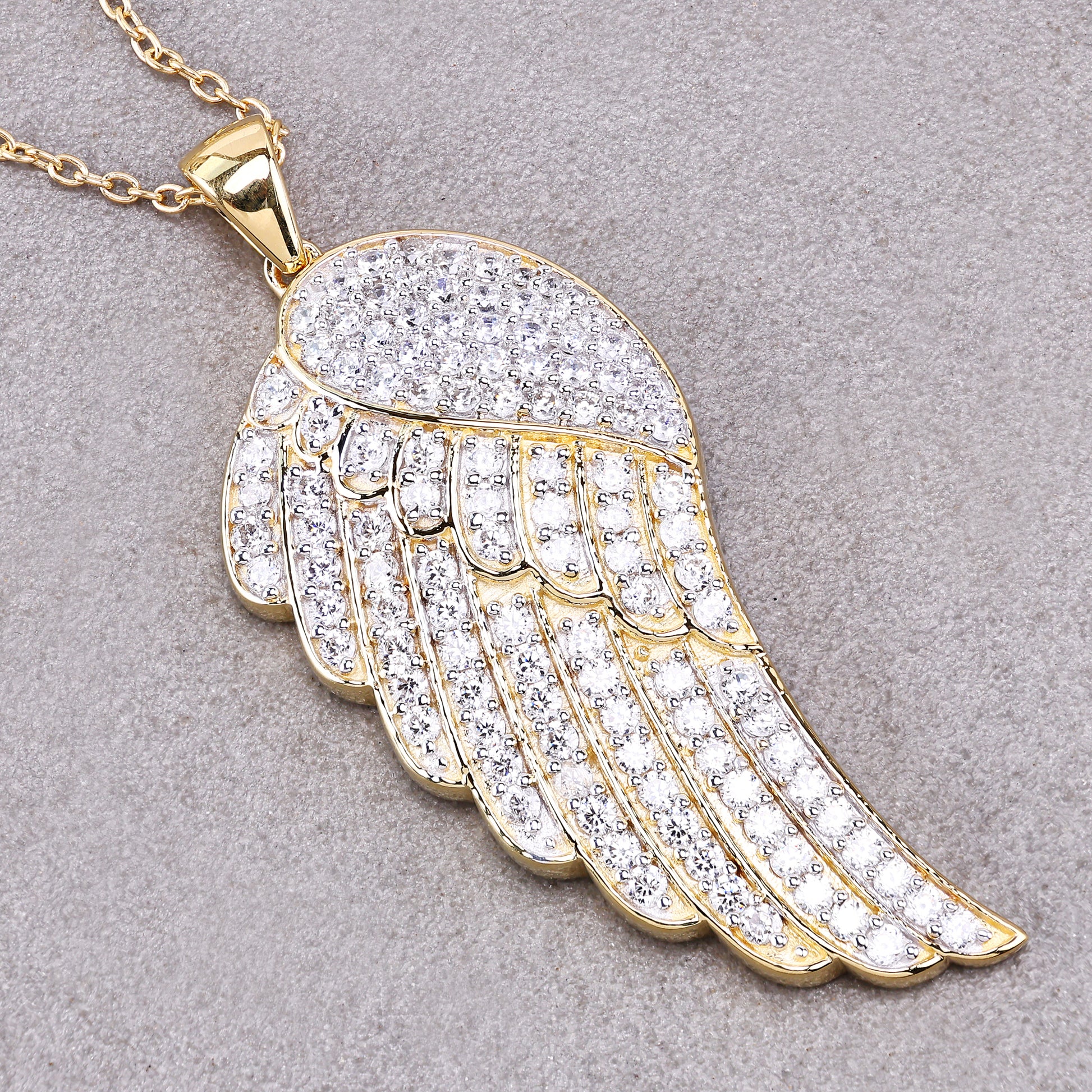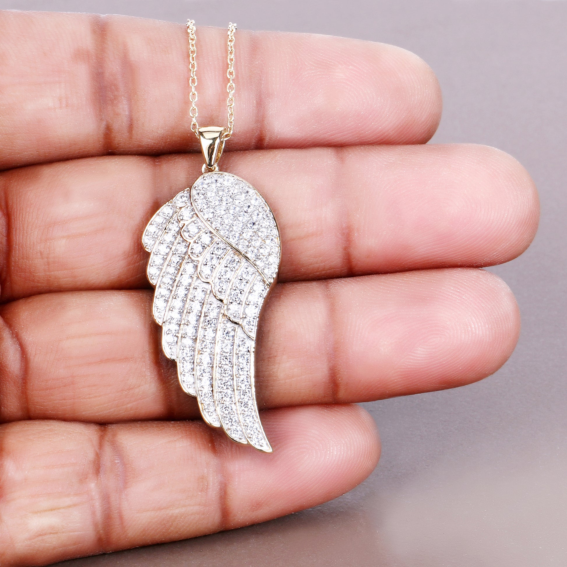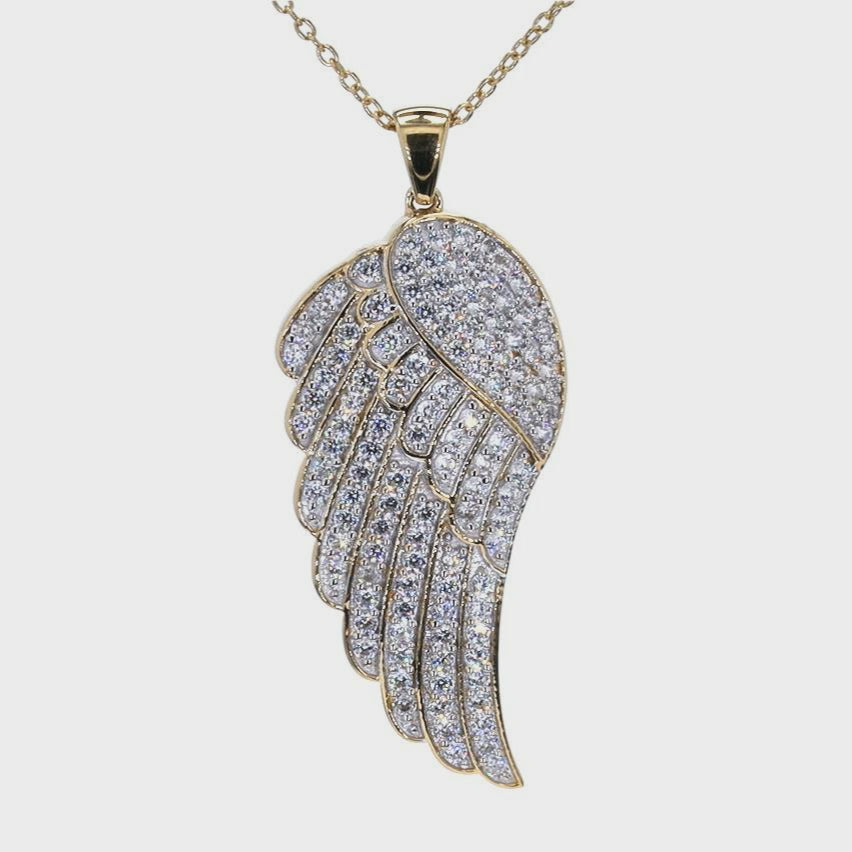 The delicate VVS diamond simulant rounds are set along the wing, offering a brilliant sparkle that enhances the pendant's luxurious look. Hanging from an 18-inch chain, this piece is ideal for both casual and formal wear, adding a graceful, elegant accent to any outfit. Whether you're treating yourself or gifting a loved one, this angel wing pendant is a timeless symbol of love and care.