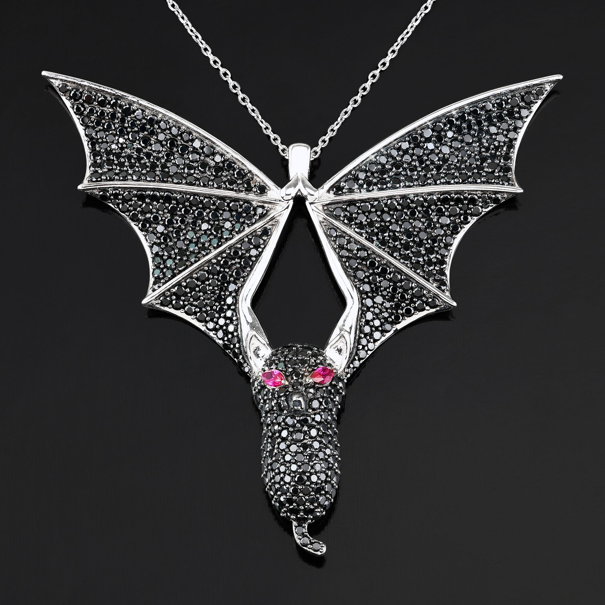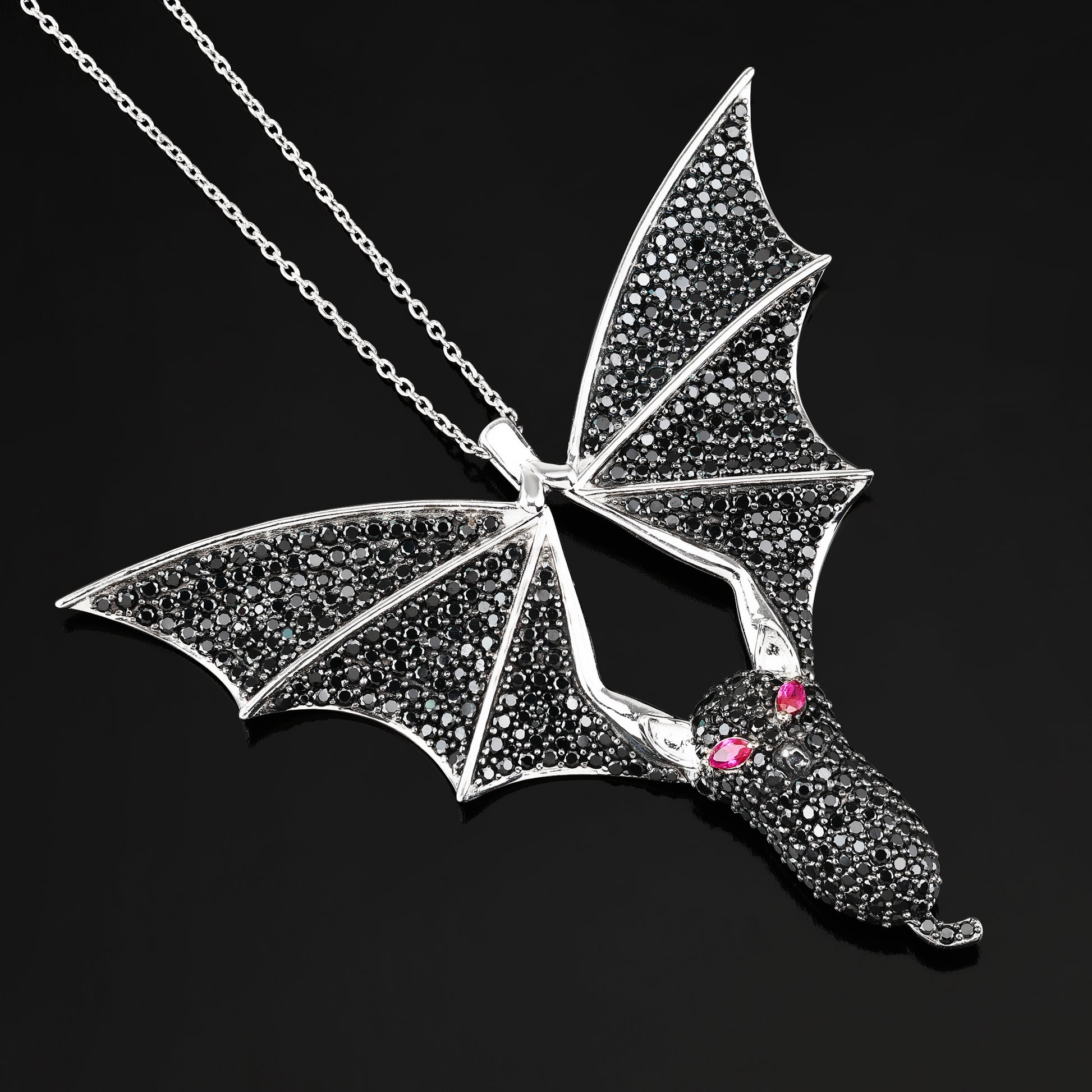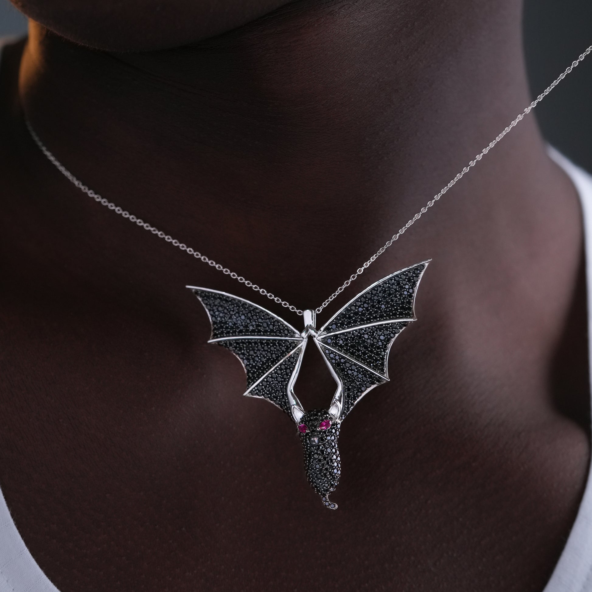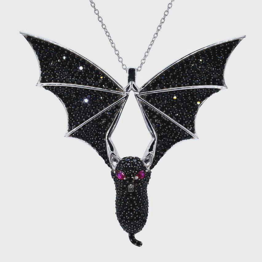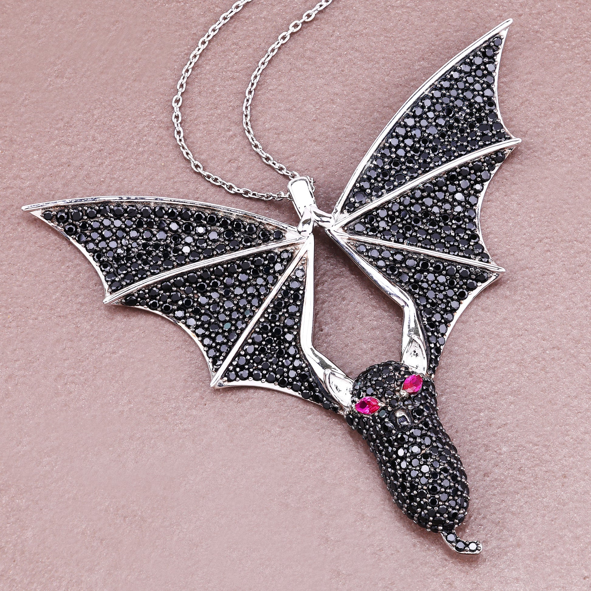 Embrace the darkness with this stunning Bat Pendant, crafted in .925 sterling silver and finished with platinum plating for lasting shine. The pendant showcases intricate bat wings covered in black spinel rounds, creating a captivating sparkle. The eyes, set with ruby-colored cubic zirconia, give the bat a striking, vibrant look that contrasts beautifully with the black stones.