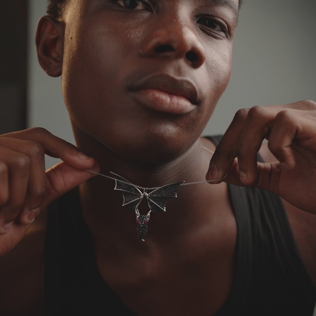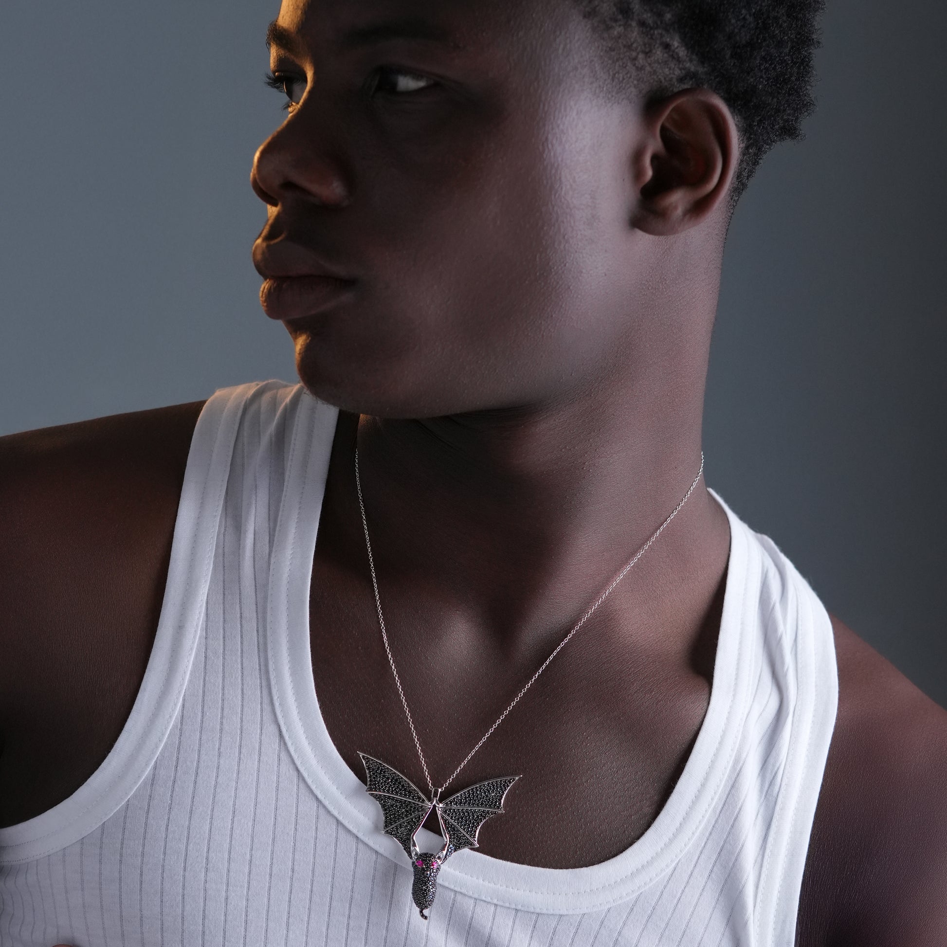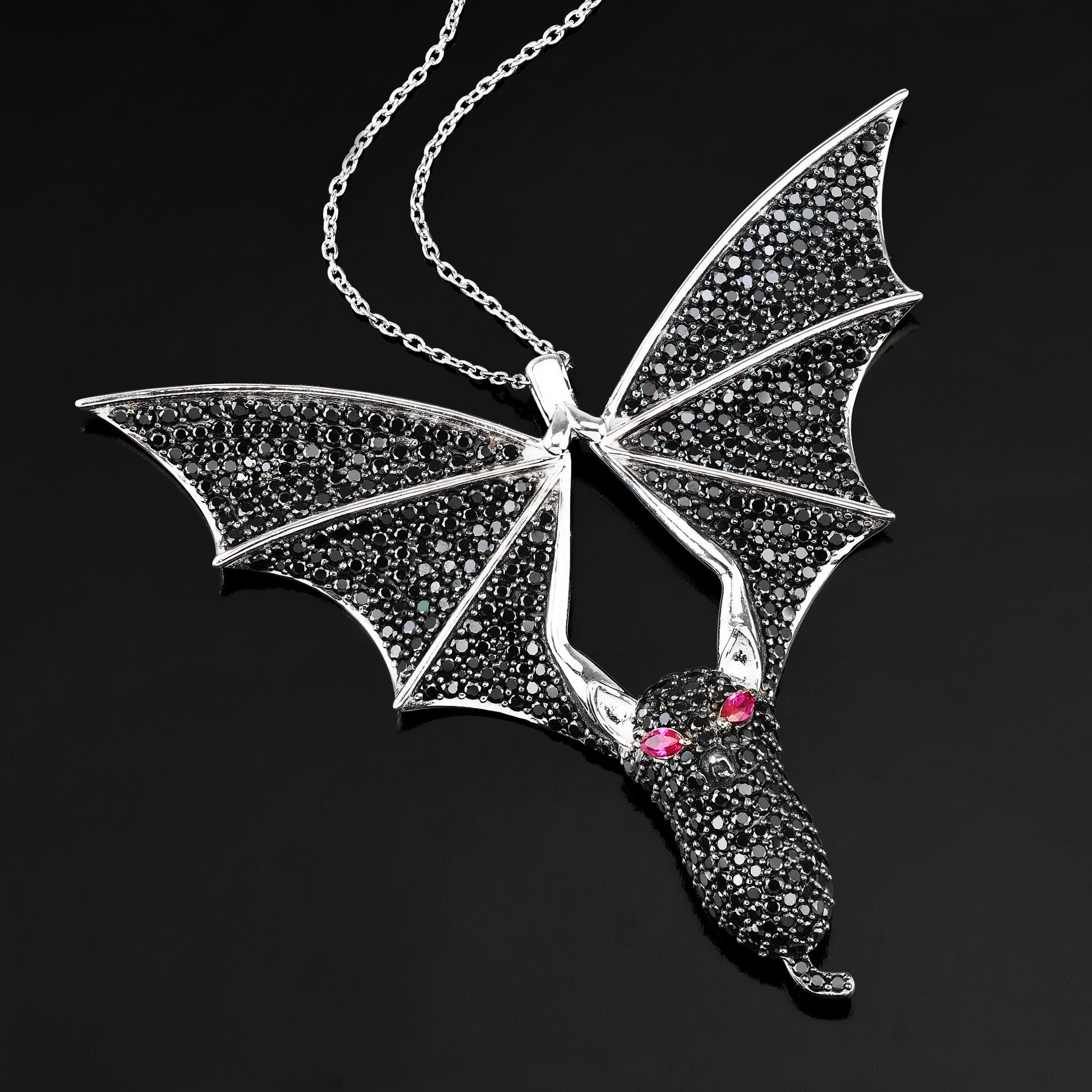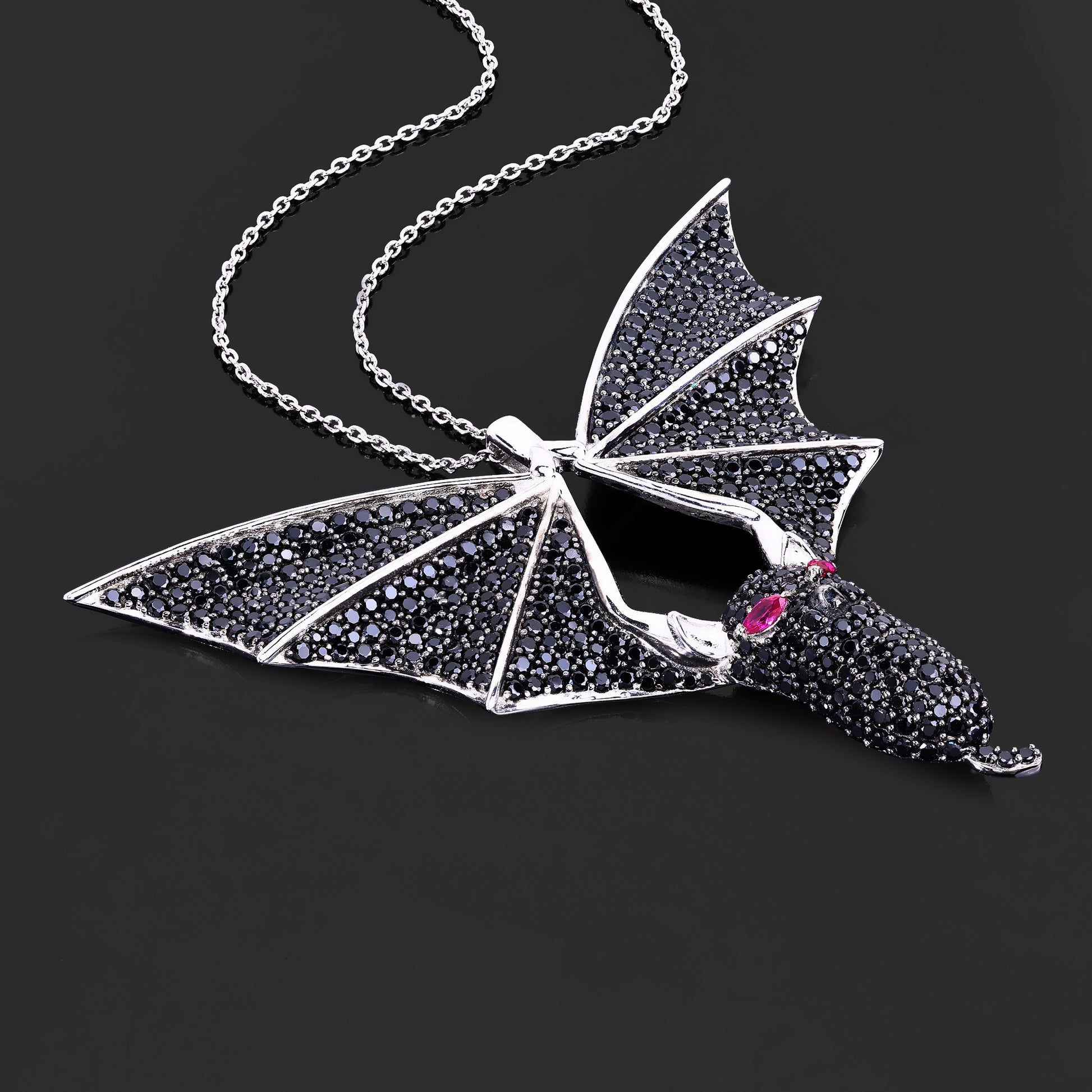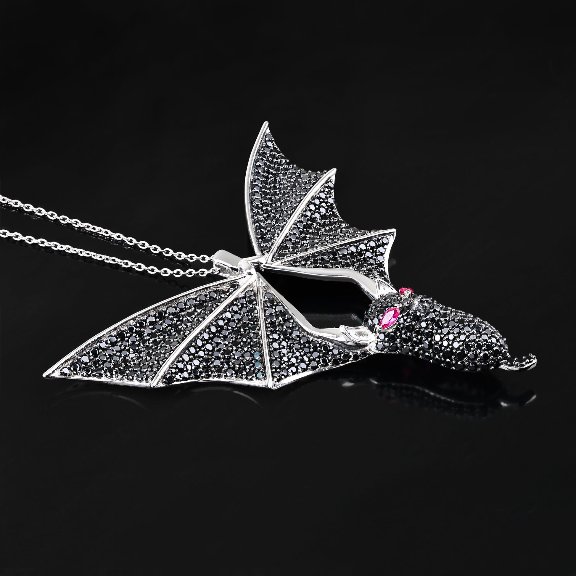Embrace the darkness with this stunning Bat Pendant, crafted in .925 sterling silver and finished with platinum plating for lasting shine. The pendant showcases intricate bat wings covered in black spinel rounds, creating a captivating sparkle. The eyes, set with ruby-colored cubic zirconia, give the bat a striking, vibrant look that contrasts beautifully with the black stones.