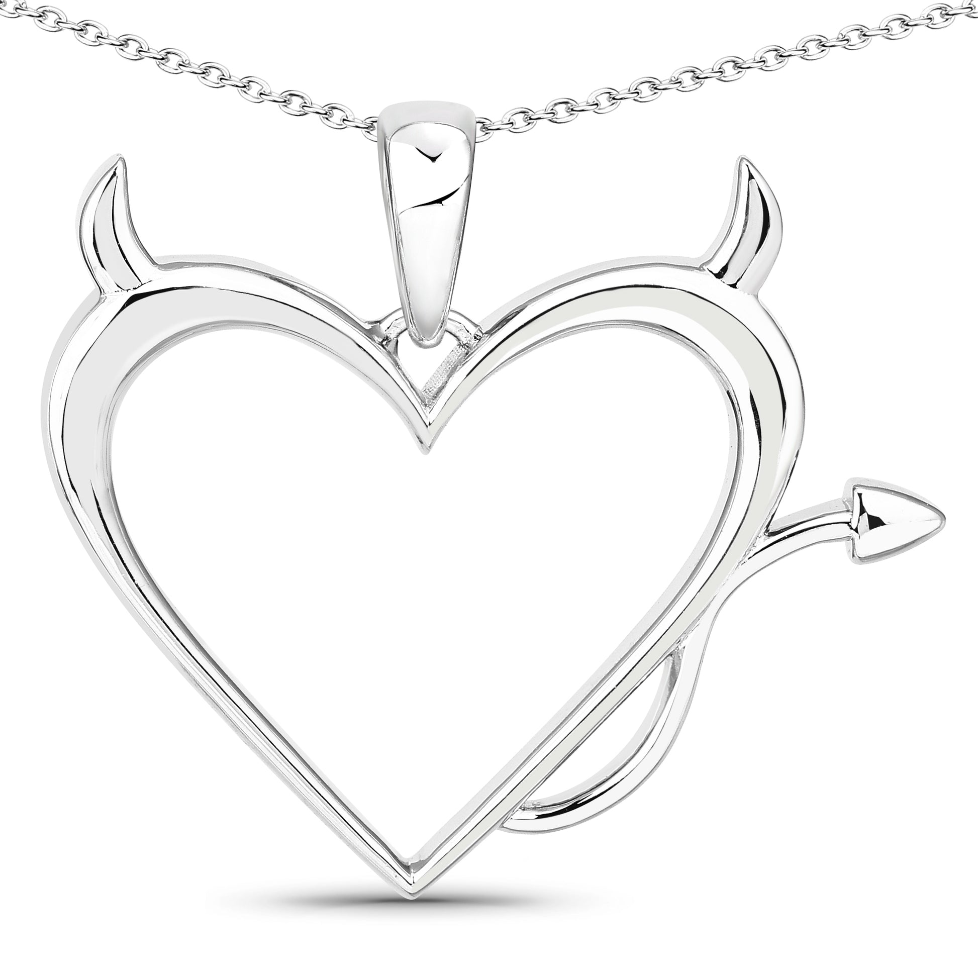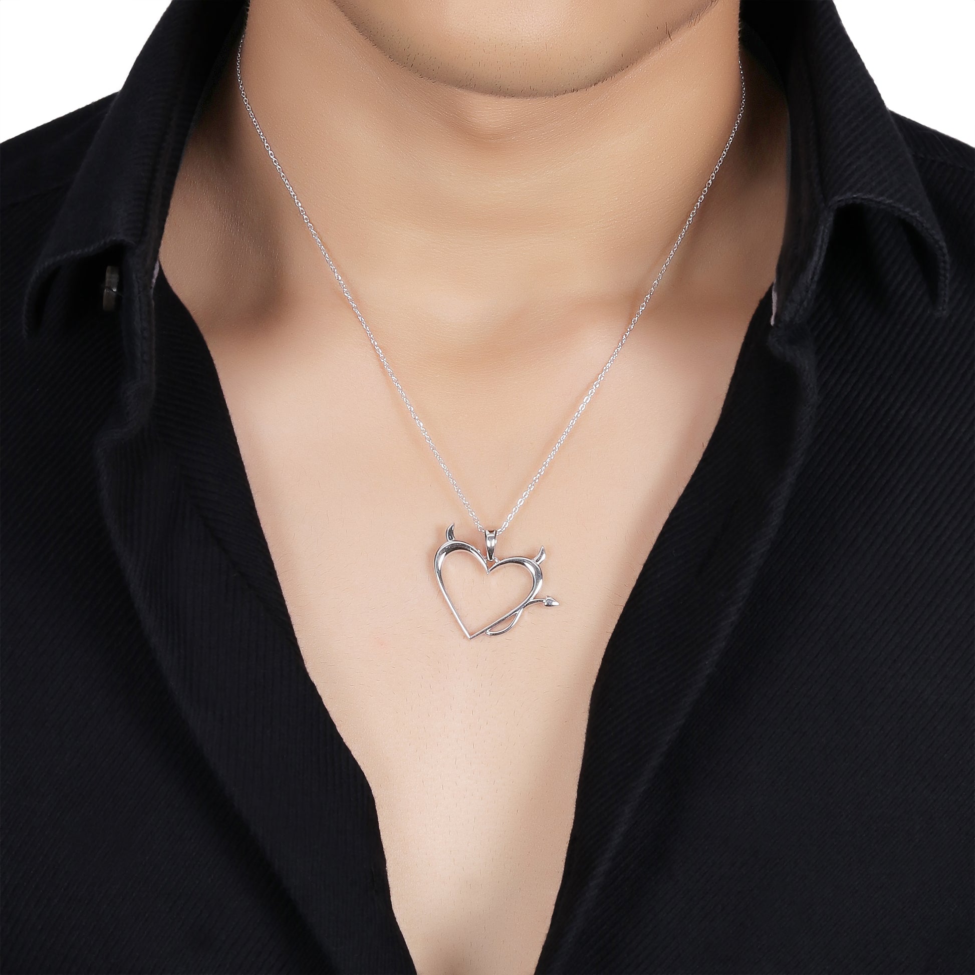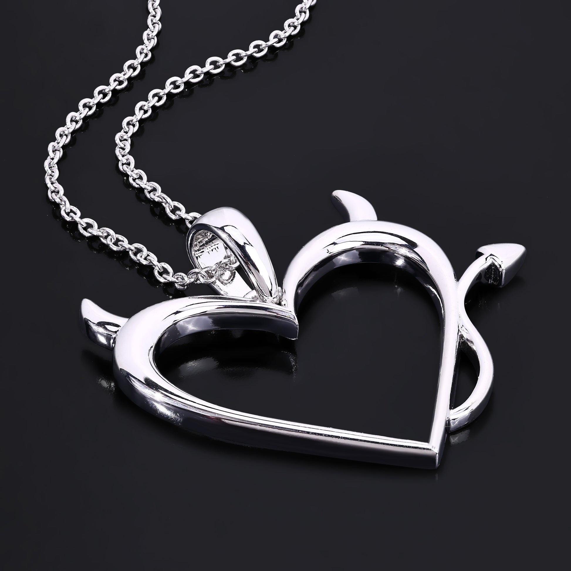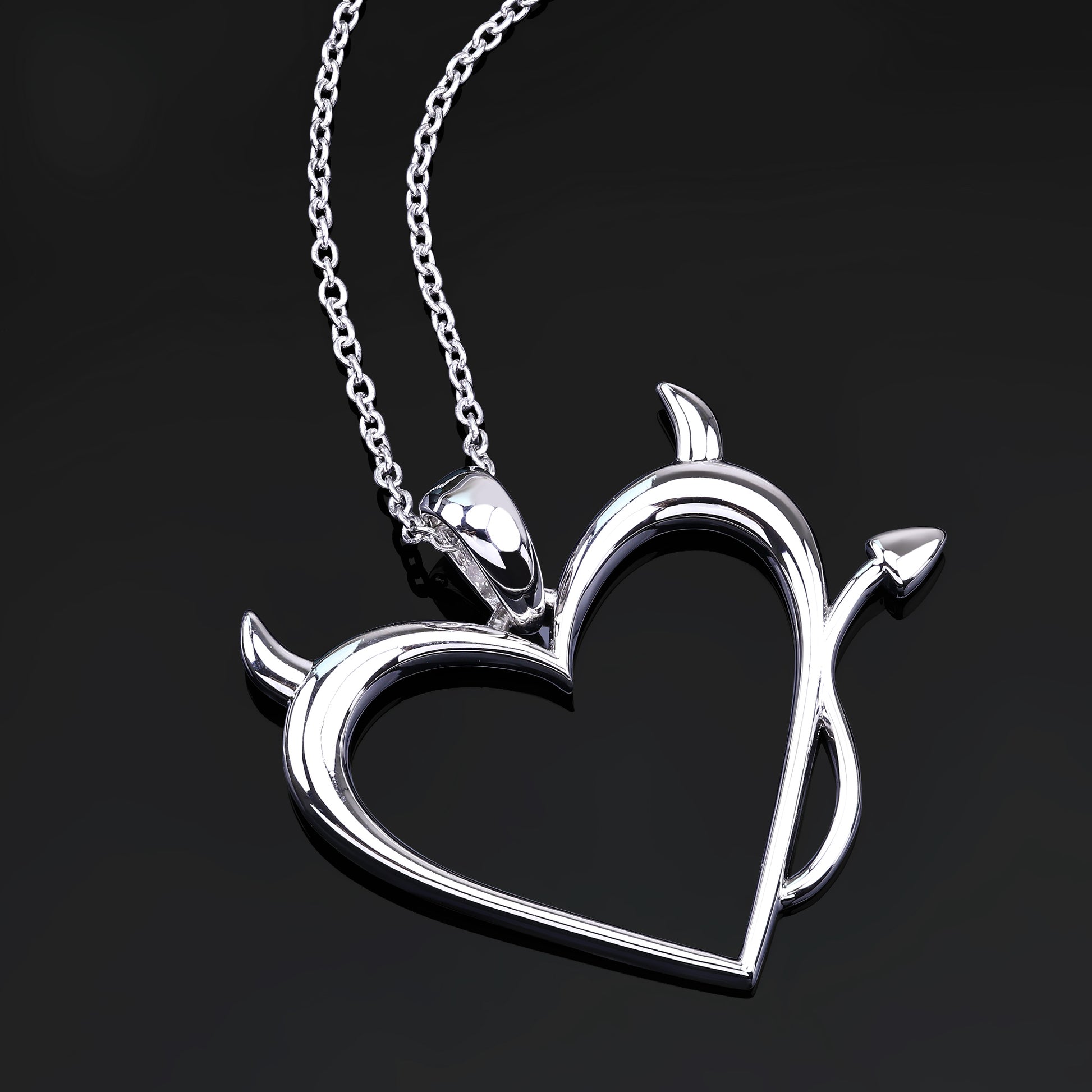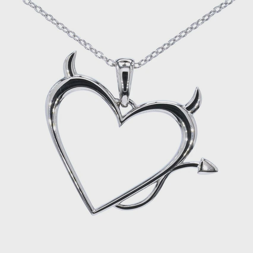 Showcase your daring personality with this striking Devil Heart Pendant, designed in brass and plated with platinum for a sleek, tarnish-resistant finish. The heart-shaped pendant is adorned with devilish details, including sharp horns and a playful tail, offering a cheeky yet elegant take on a traditional heart design.