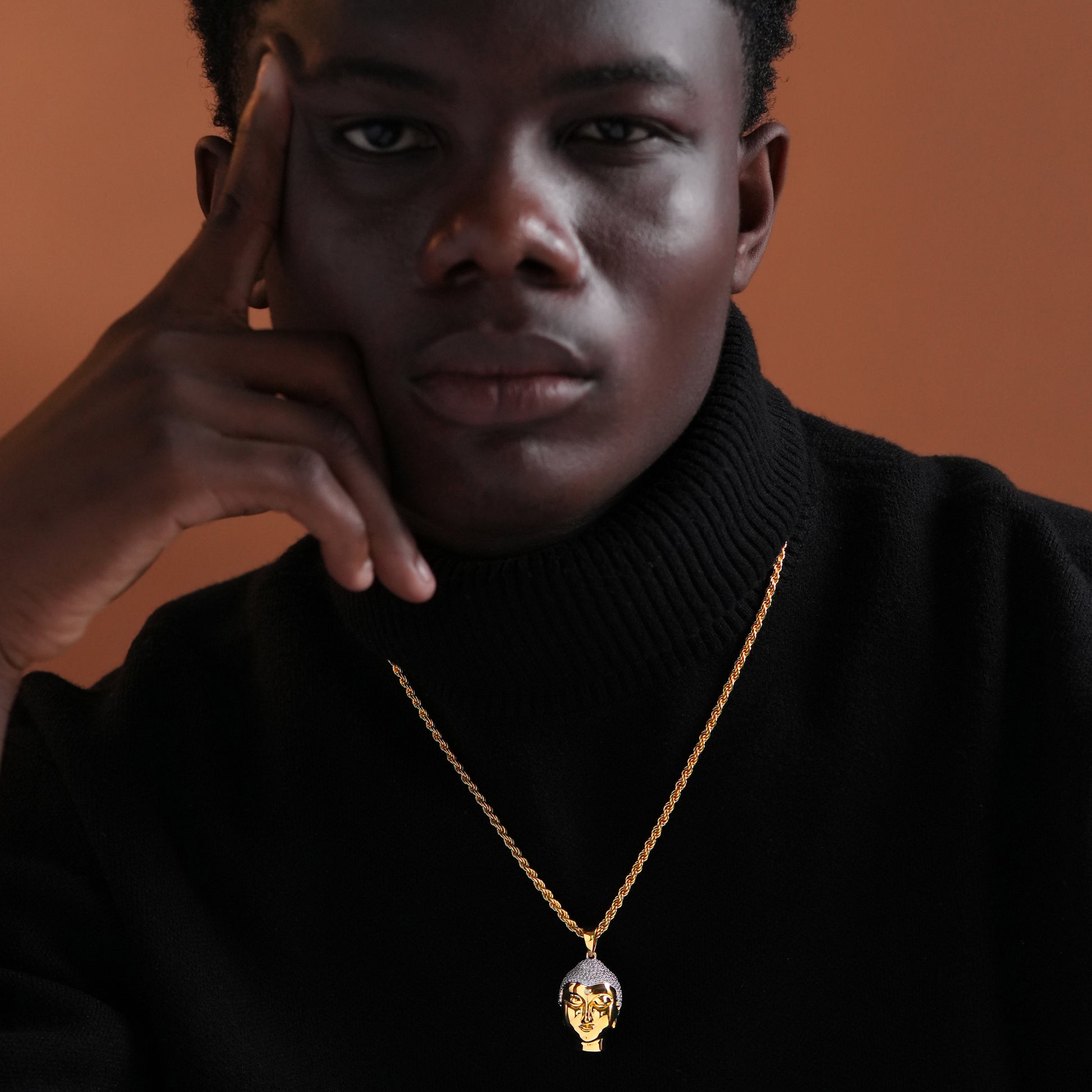 Crafted in 14K yellow gold-plated silver, this intricately detailed pendant showcases Buddha’s calm and meditative expression, radiating tranquility. The Simulated diamonds adorn the head, symbolizing purity and divine energy.