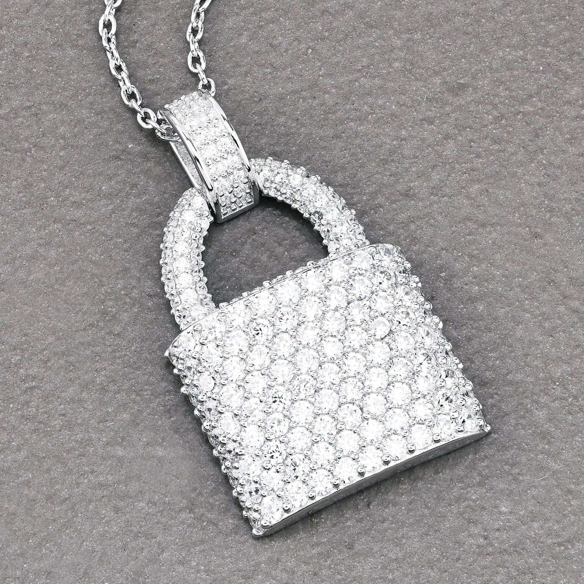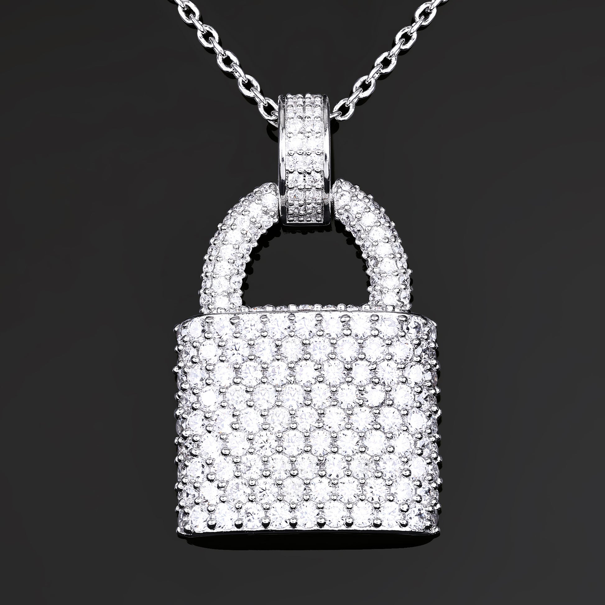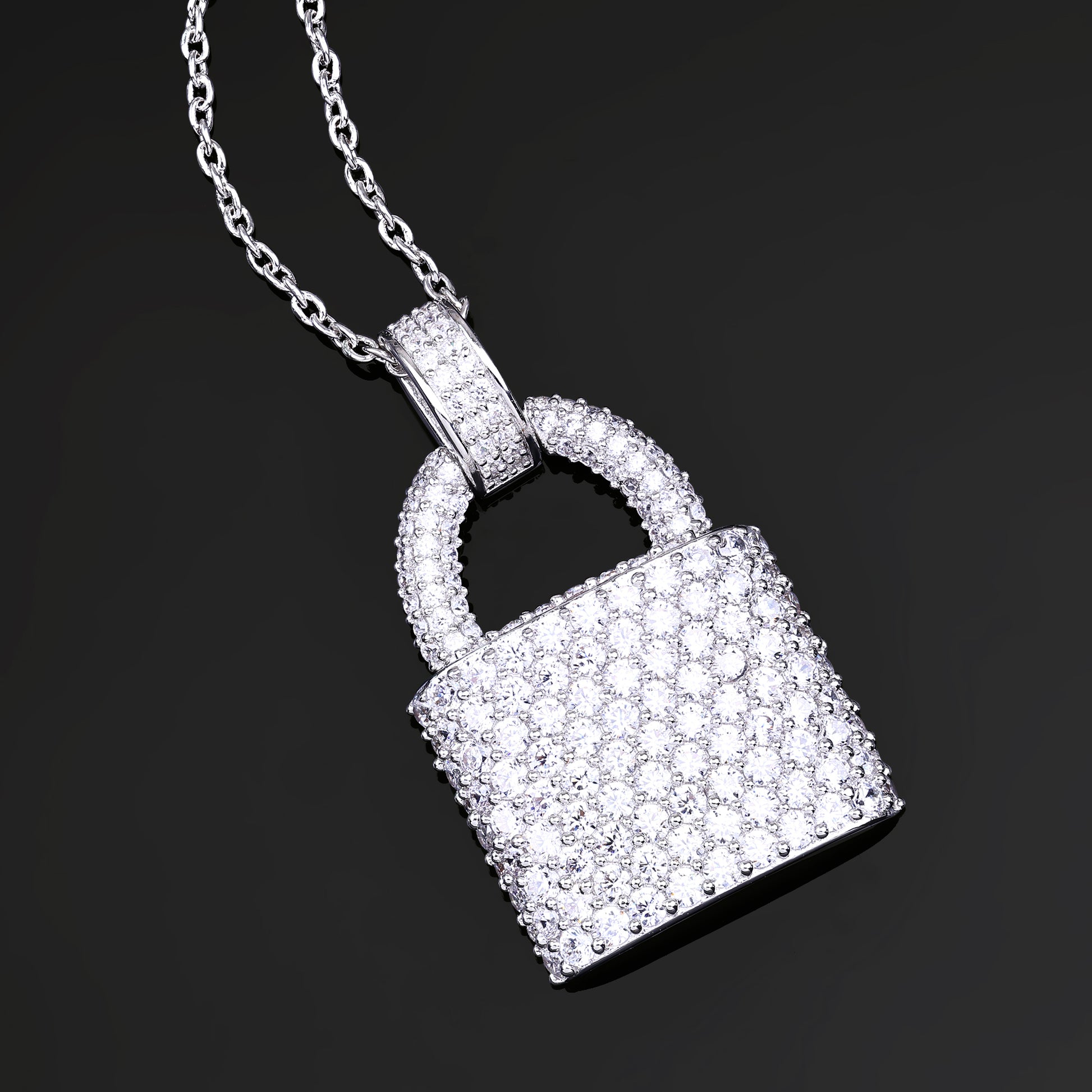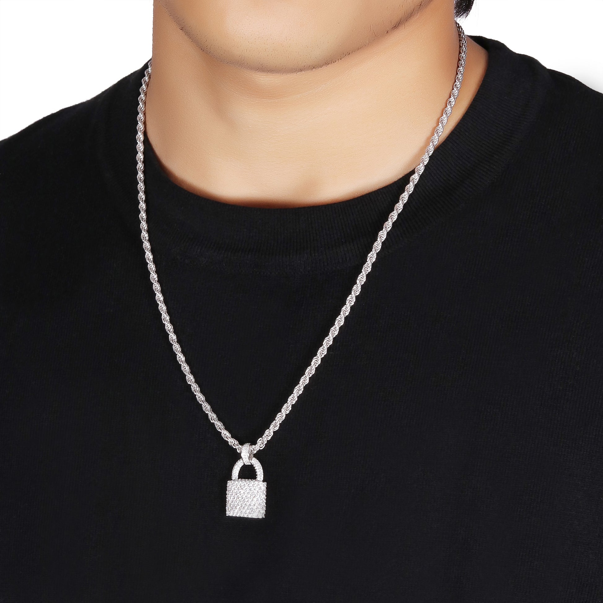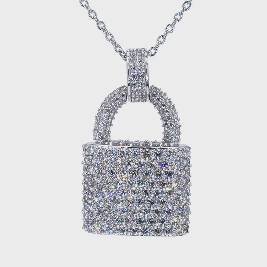 Make a bold statement with this Lock Pendant, designed in brass and coated with rhodium plating for durability and lasting brilliance. Encrusted with dazzling VVS diamond simulant rounds, this pendant exudes elegance and sophistication. The lock design, a symbol of trust and protection, adds a unique touch to this already eye-catching piece.