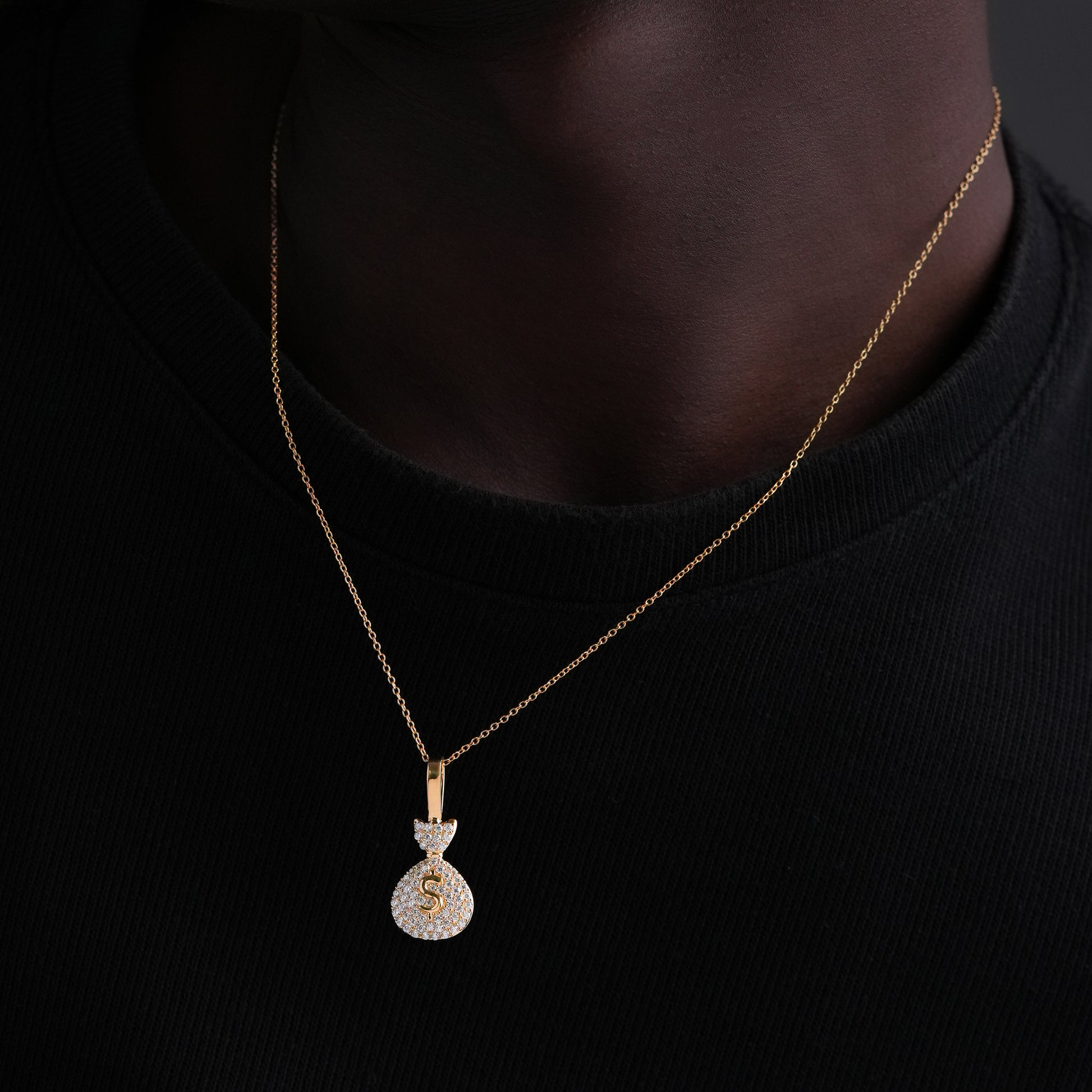 Step up your style game with this eye-catching Money Bag Pendant, made from .925 sterling silver and finished with 14K yellow gold plating for a striking, radiant look. The pendant is embellished with simulated diamonds that shimmer brilliantly, symbolizing wealth and prosperity.