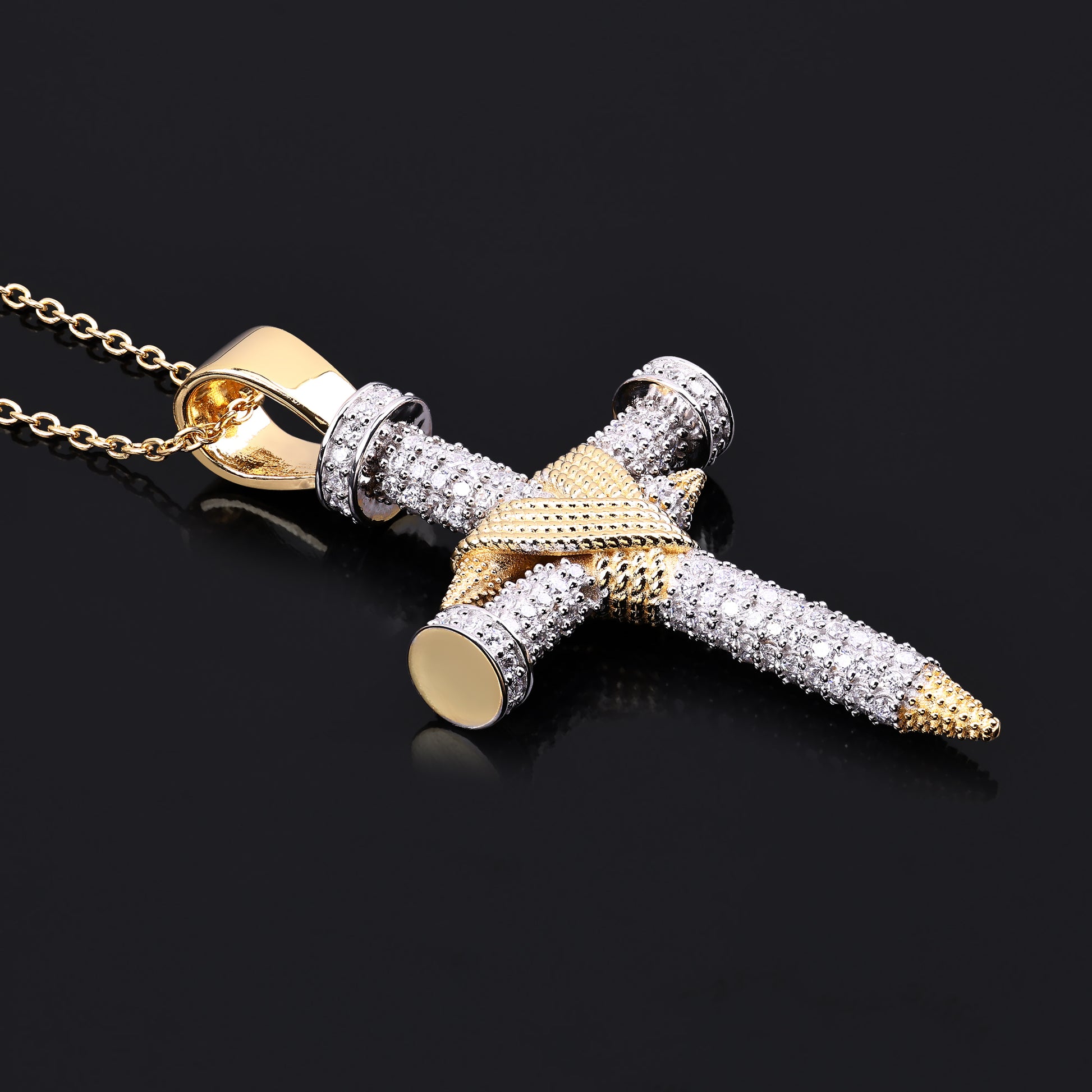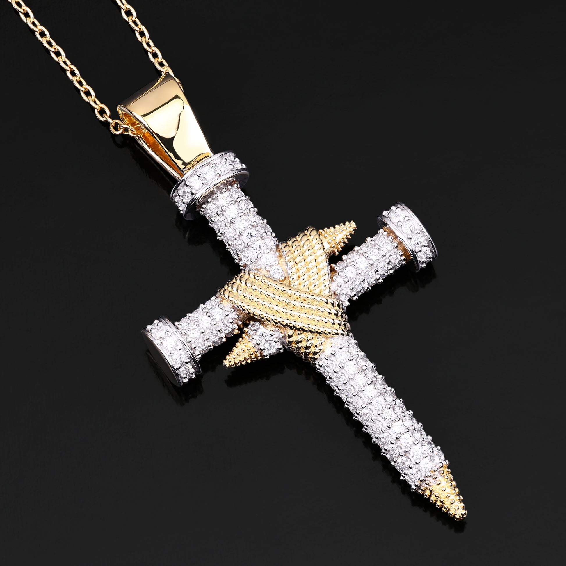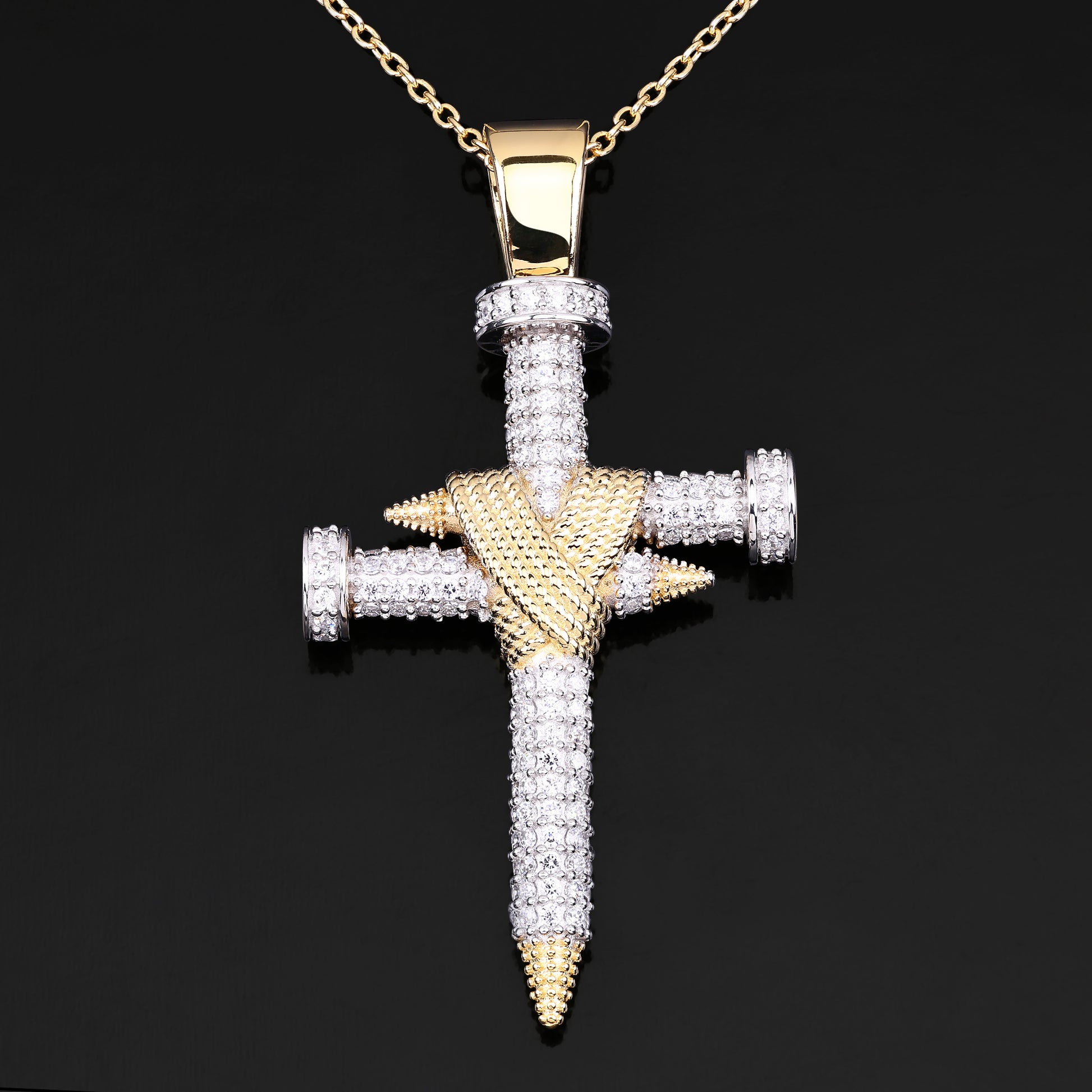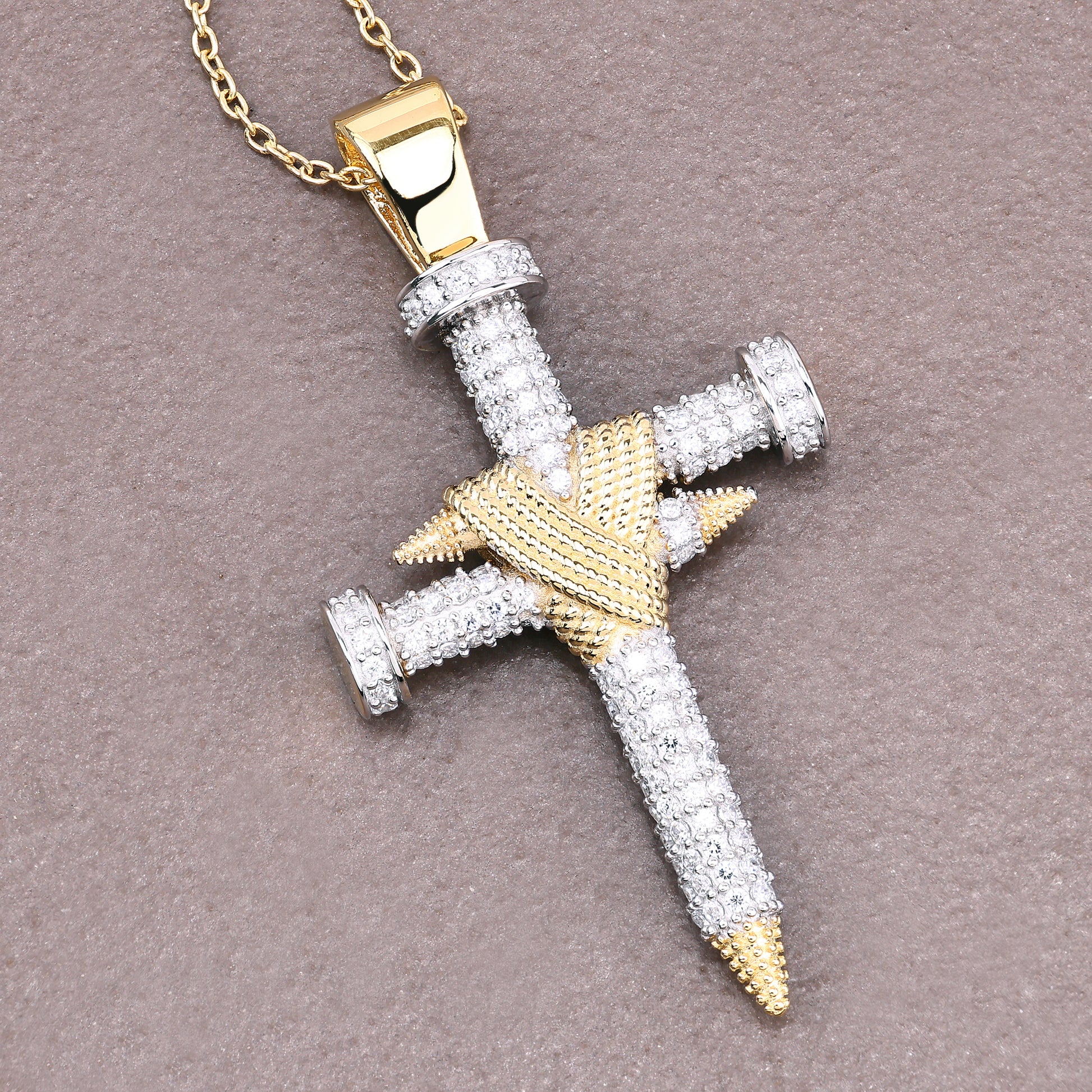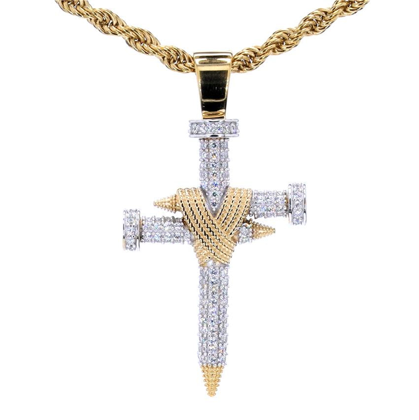This Double Nail Cross X Pendant is a bold expression of faith, resilience, and sacrifice. Crafted in 14K yellow gold-plated silver, the striking design features two intersecting nails, symbolizing unwavering devotion and perseverance. The intricate detailing, including VVS diamond simulant rounds, enhances its brilliance, while the gold-wrapped accents add depth and contrast.