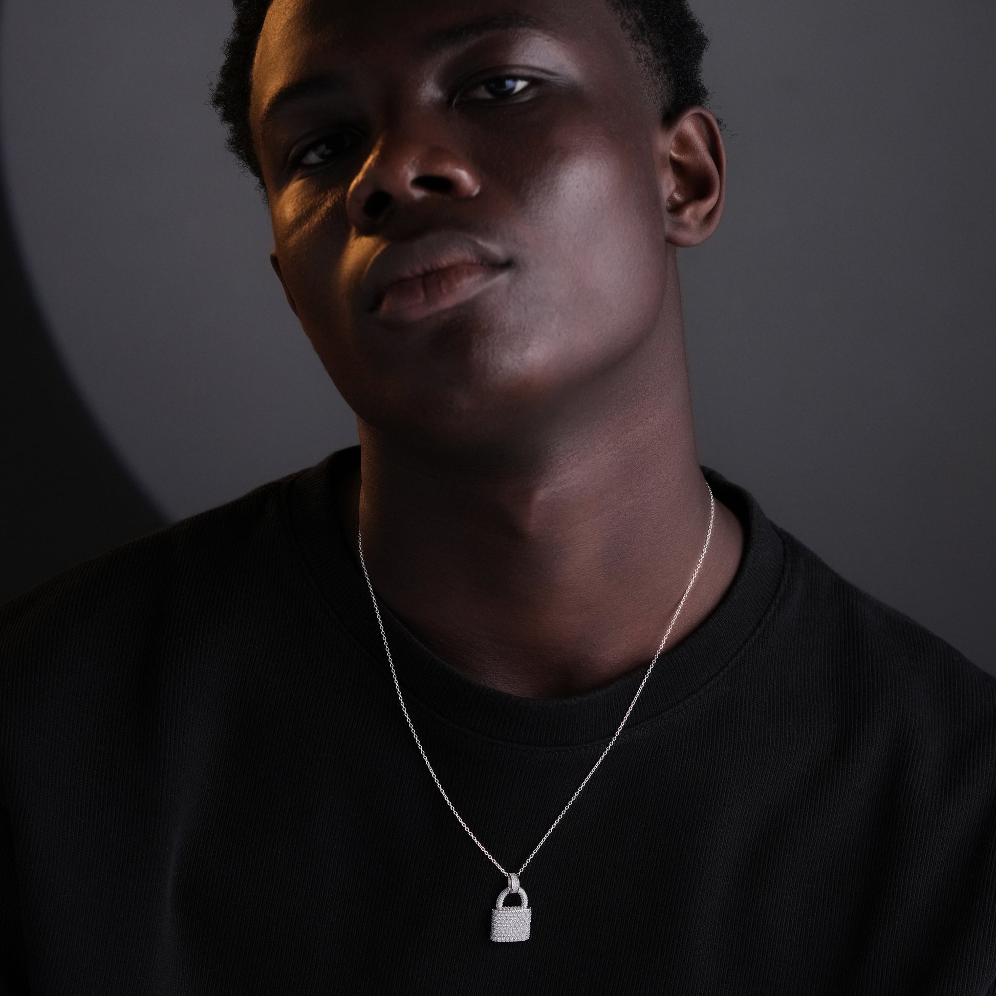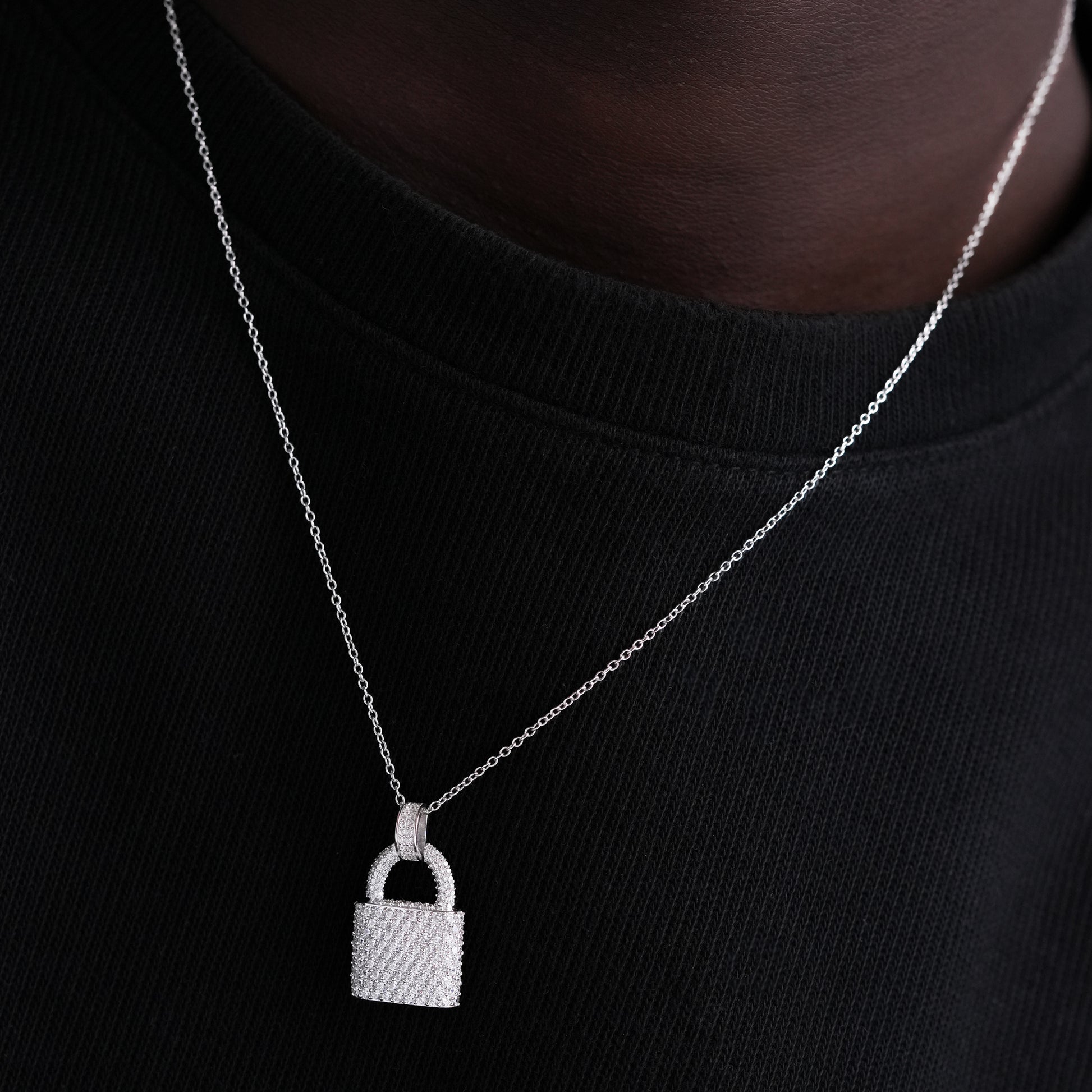 Make a bold statement with this Pave Padlock Pendant, designed in brass and coated with rhodium plating for durability and lasting brilliance. Encrusted with dazzling simulated diamonds, This pendant exudes elegance and sophistication. The lock design, a symbol of trust and protection, adds a unique touch to this already eye-catching piece.