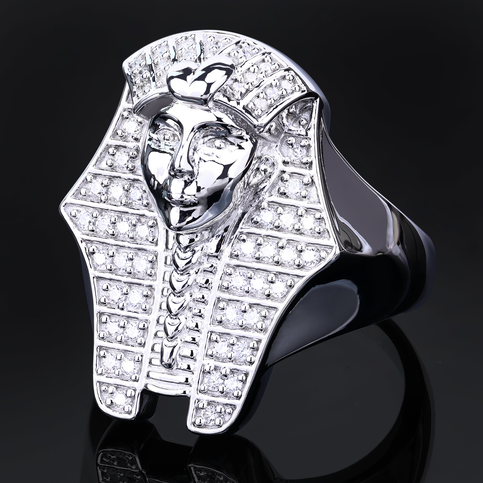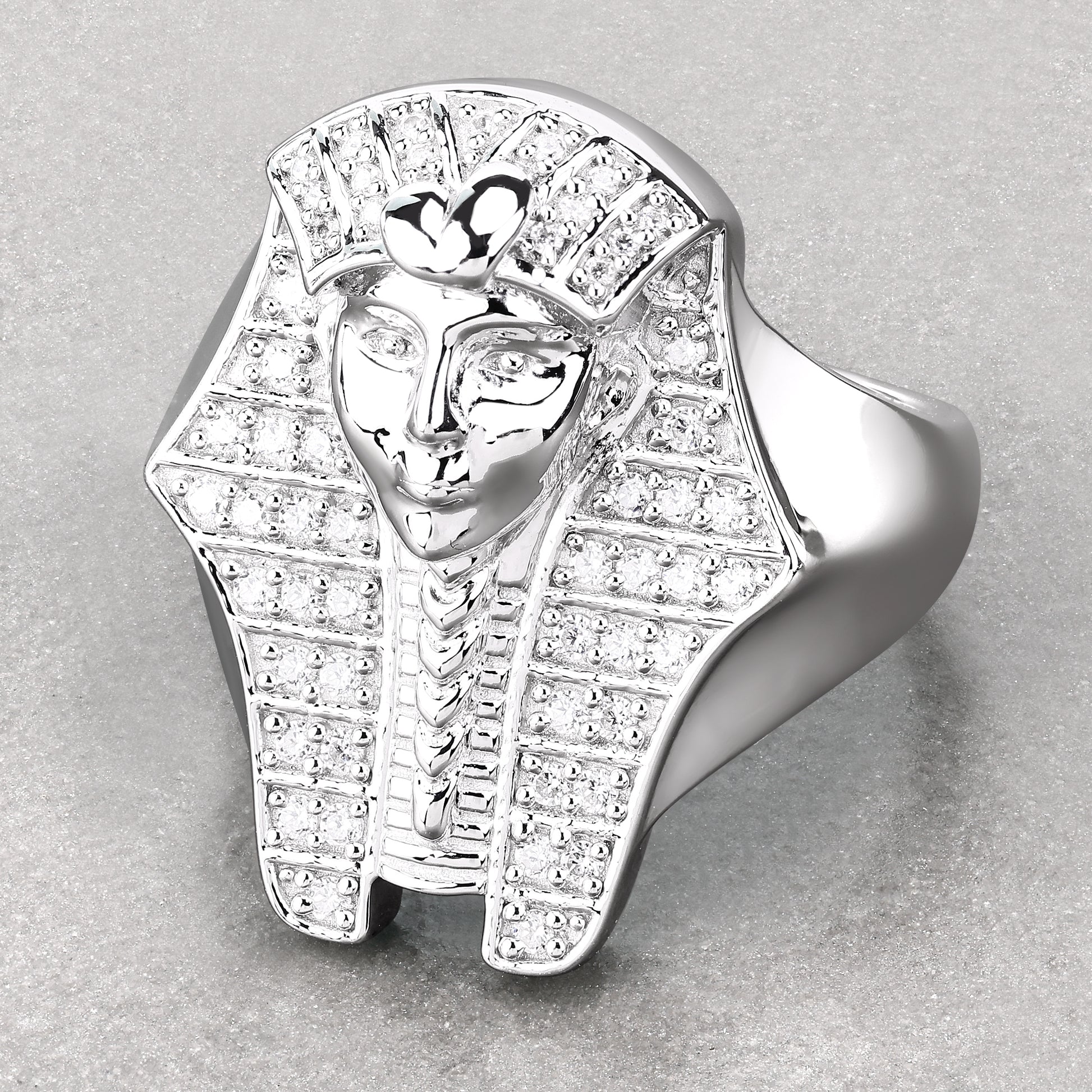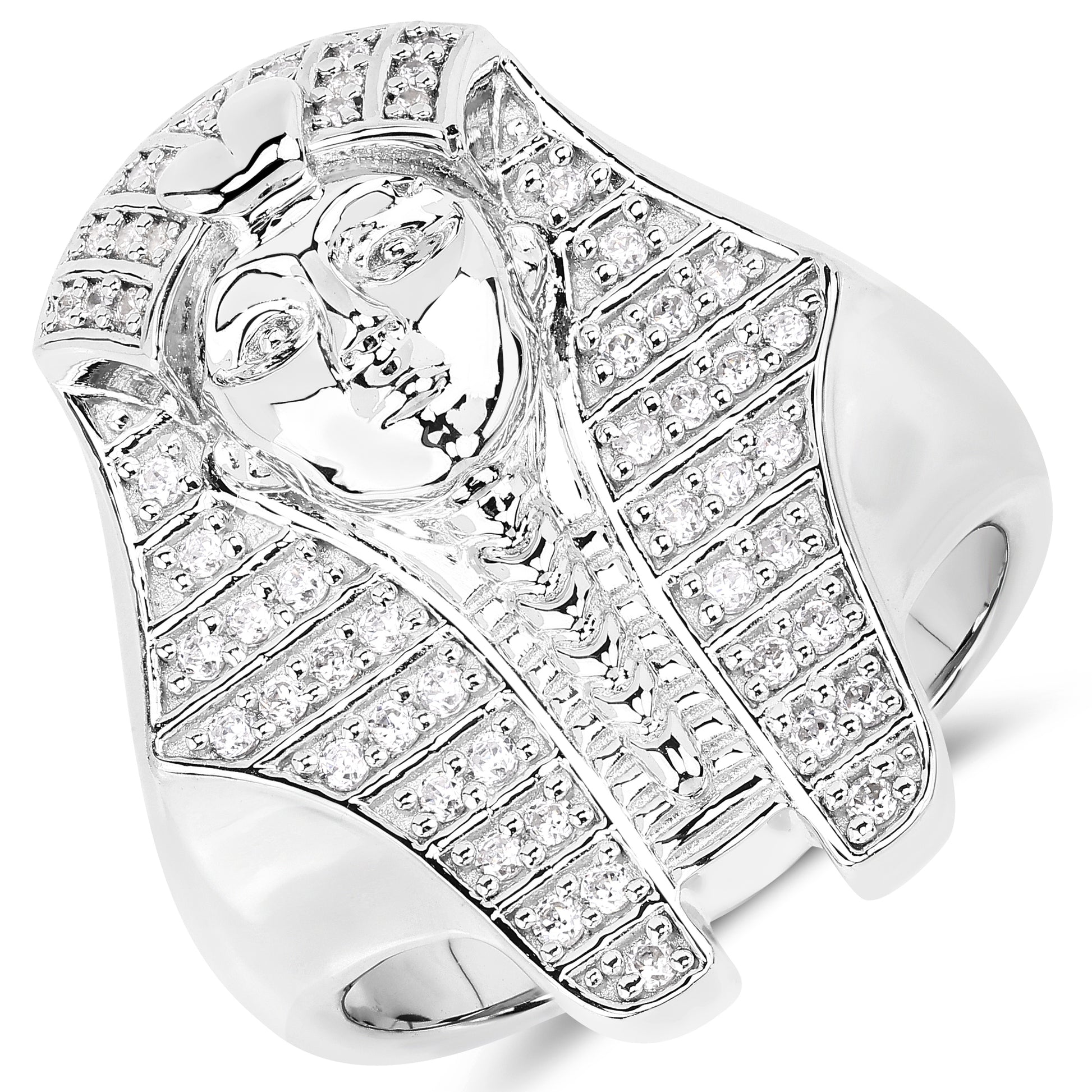 Step into a realm of history and royalty with this exceptional Pharaoh Ring, designed in .925 sterling silver and polished with rhodium plating for a sleek, long-lasting shine. The ring showcases an intricately carved pharaoh motif, encrusted with rows of shimmering VVS diamond simulant rounds, exuding power and luxury.