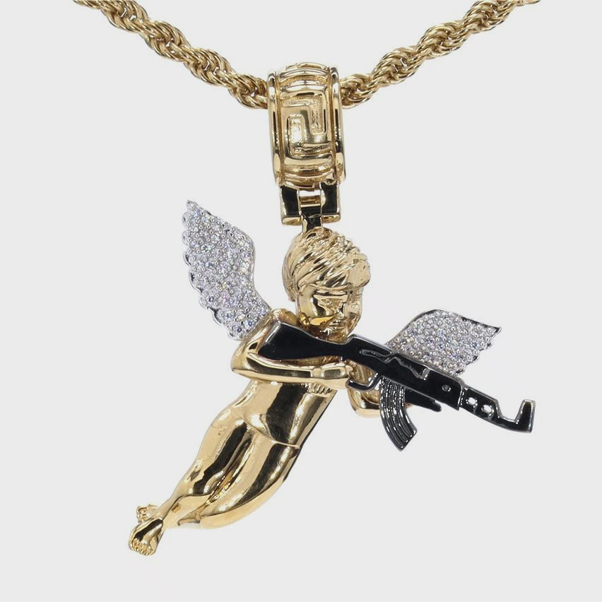 A striking fusion of celestial grace and urban edge, this Angel Shooting Gun Pendant redefines statement jewelry. Crafted in 14K yellow gold-plated silver, it showcases a finely sculpted angel in mid-flight, gripping a detailed silver firearm. The shimmering VVS diamond simulant wings add brilliance, symbolizing both purity and power.