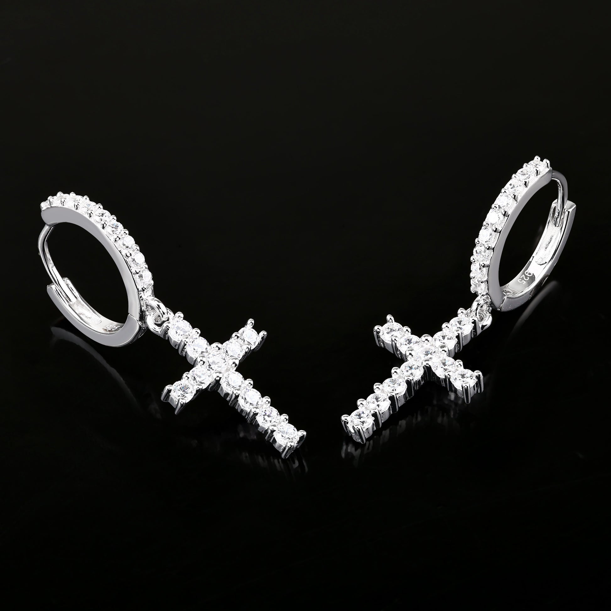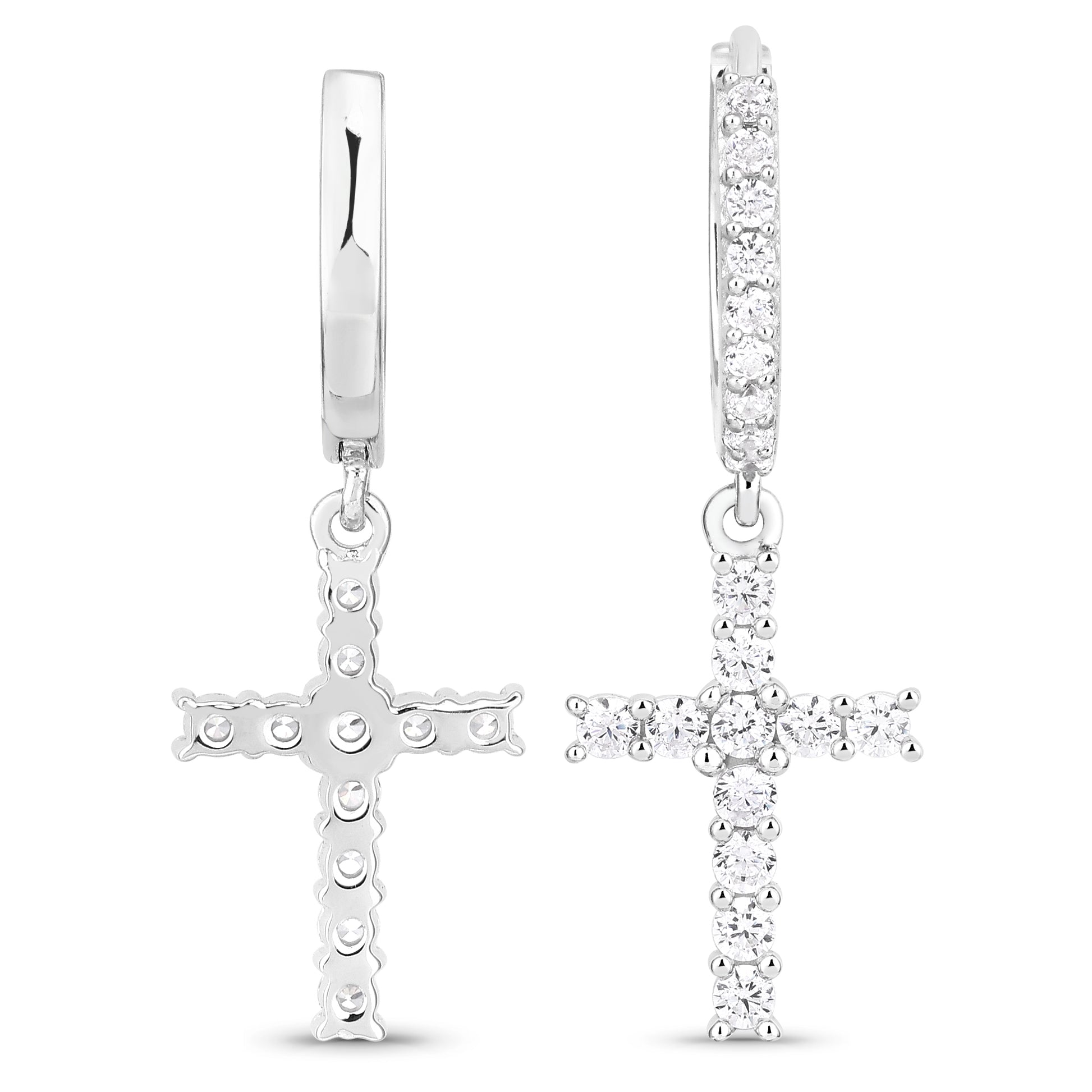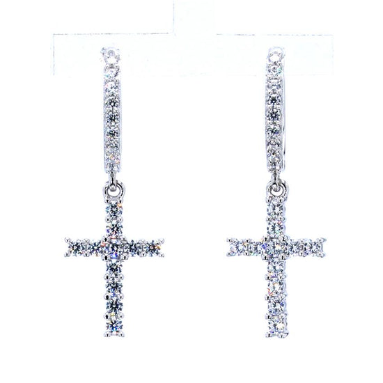 Showcase your timeless style with these beautiful Single Row Cross Earrings. Made from .925 sterling silver and plated with platinum for a brilliant shine, these earrings feature a single row of VVS diamond simulant rounds that sparkle with every movement. The delicate cross design hangs elegantly, making these earrings perfect for both everyday wear and special occasions.