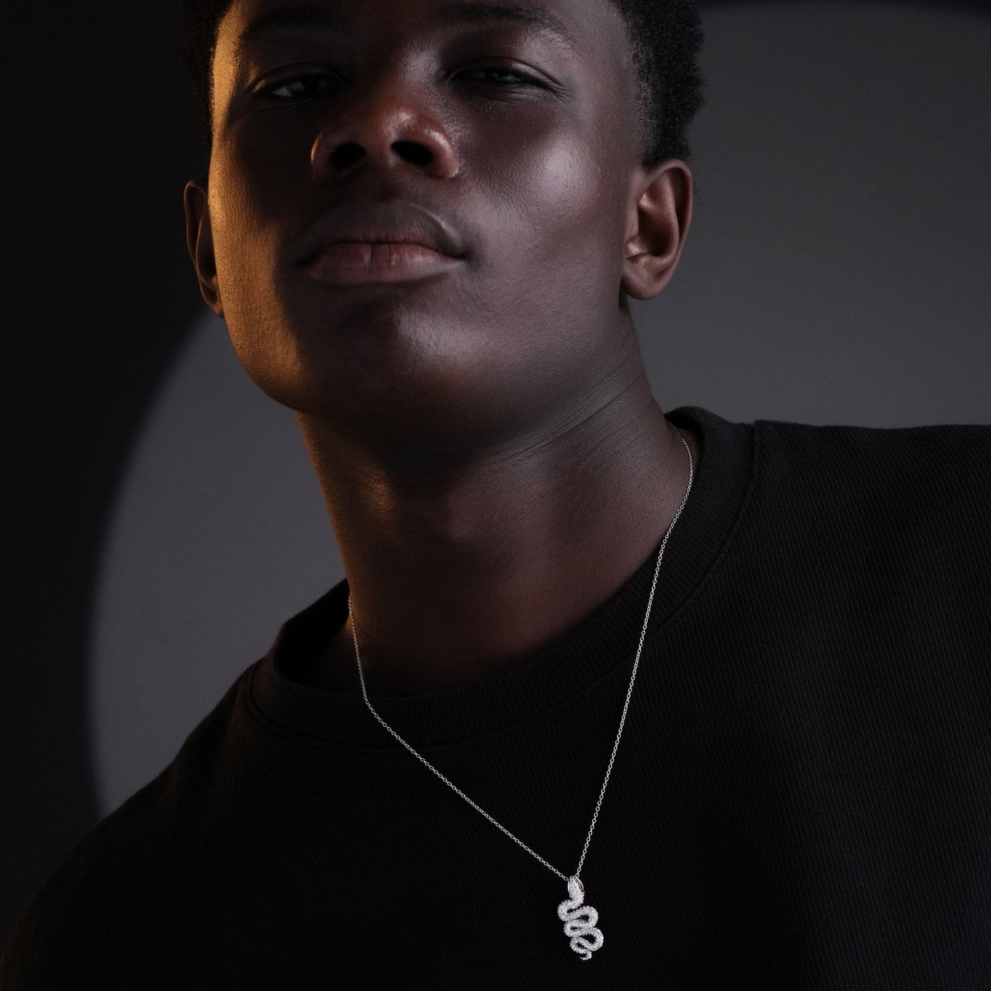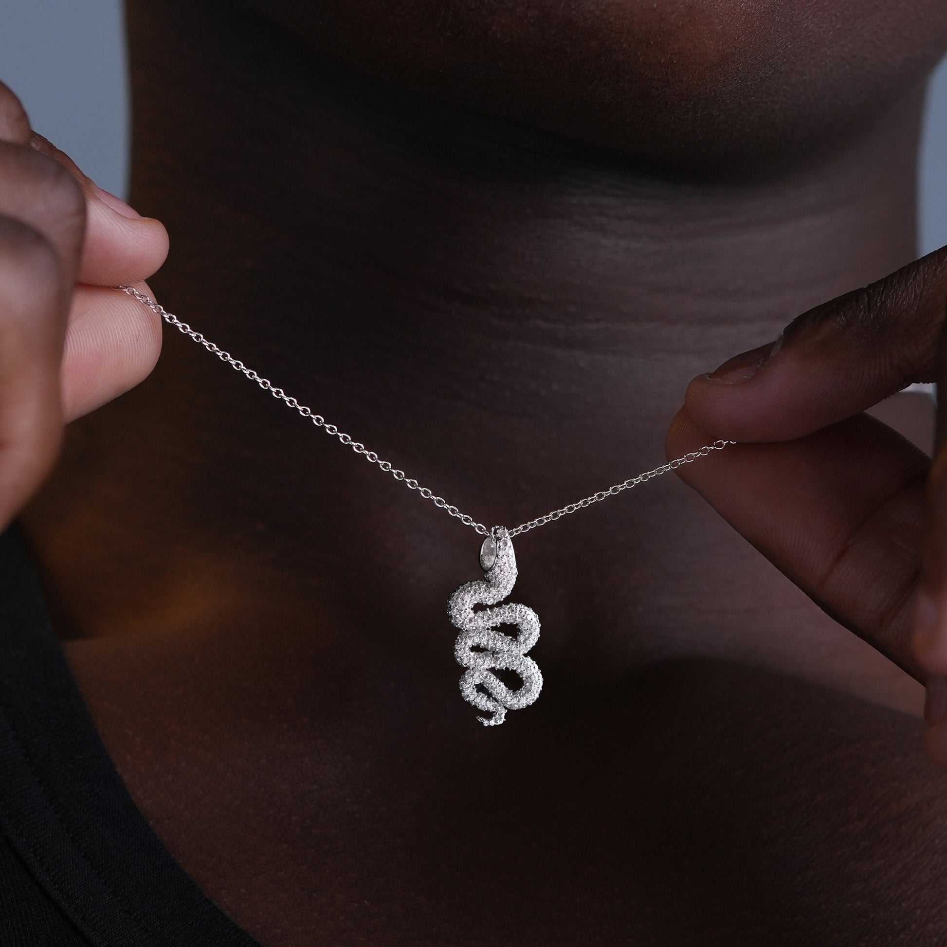 Show off your edgy, stylish side with this mesmerizing Snake Pendant. Crafted from brass and finished with high-quality rhodium plating, this pendant shines with simulated diamonds set along the snake’s elegantly coiled body. The rhodium plating not only adds a brilliant luster but also ensures durability for everyday wear.