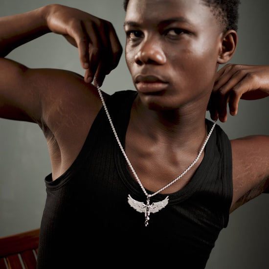 Elevate your style with the Soaring Angel Wings Pendant, a symbol of freedom, guidance, and spiritual strength. Crafted in platinum-plated silver, this breathtaking piece features an intricately detailed angel with outstretched wings, fully encrusted with simulated diamonds for an ethereal sparkle.