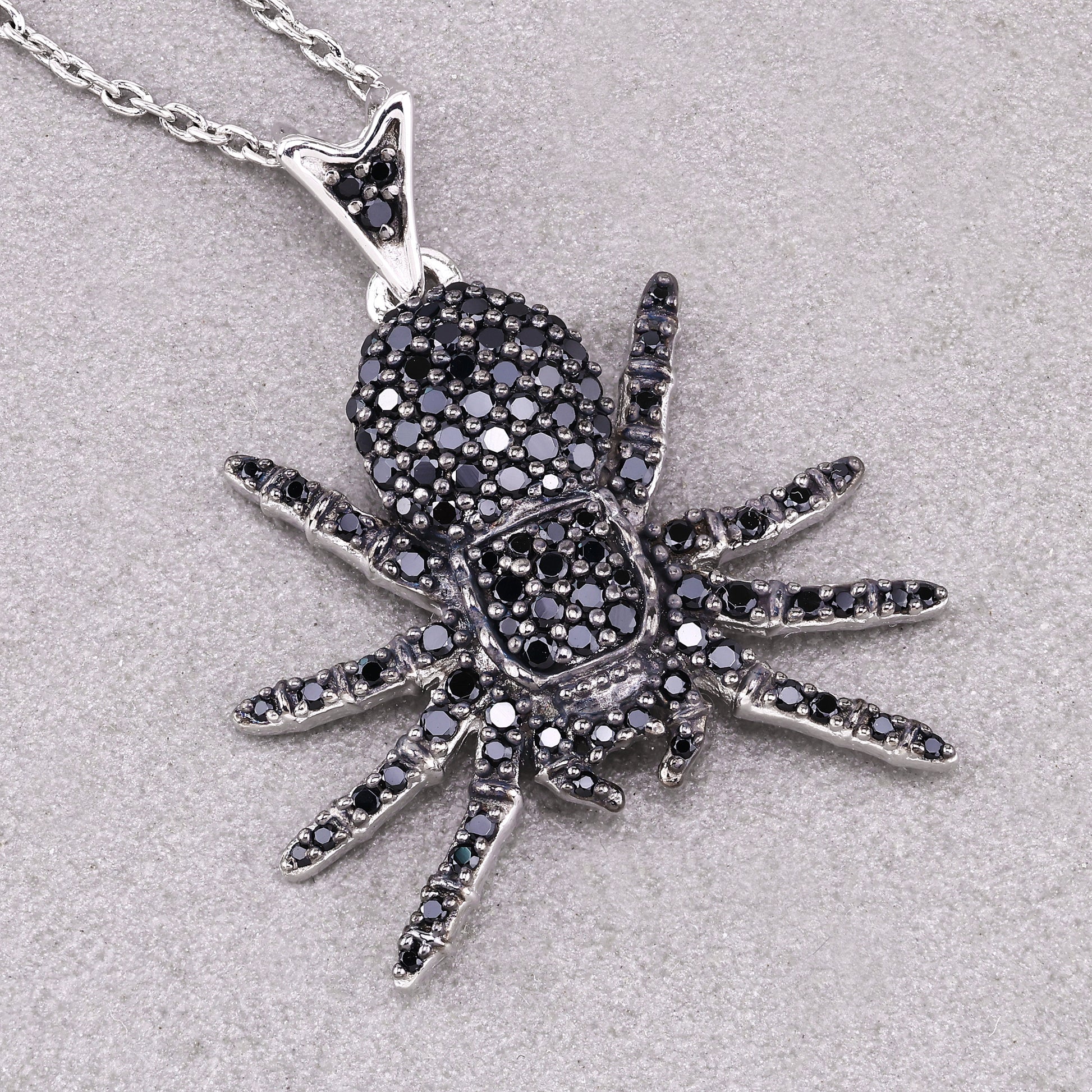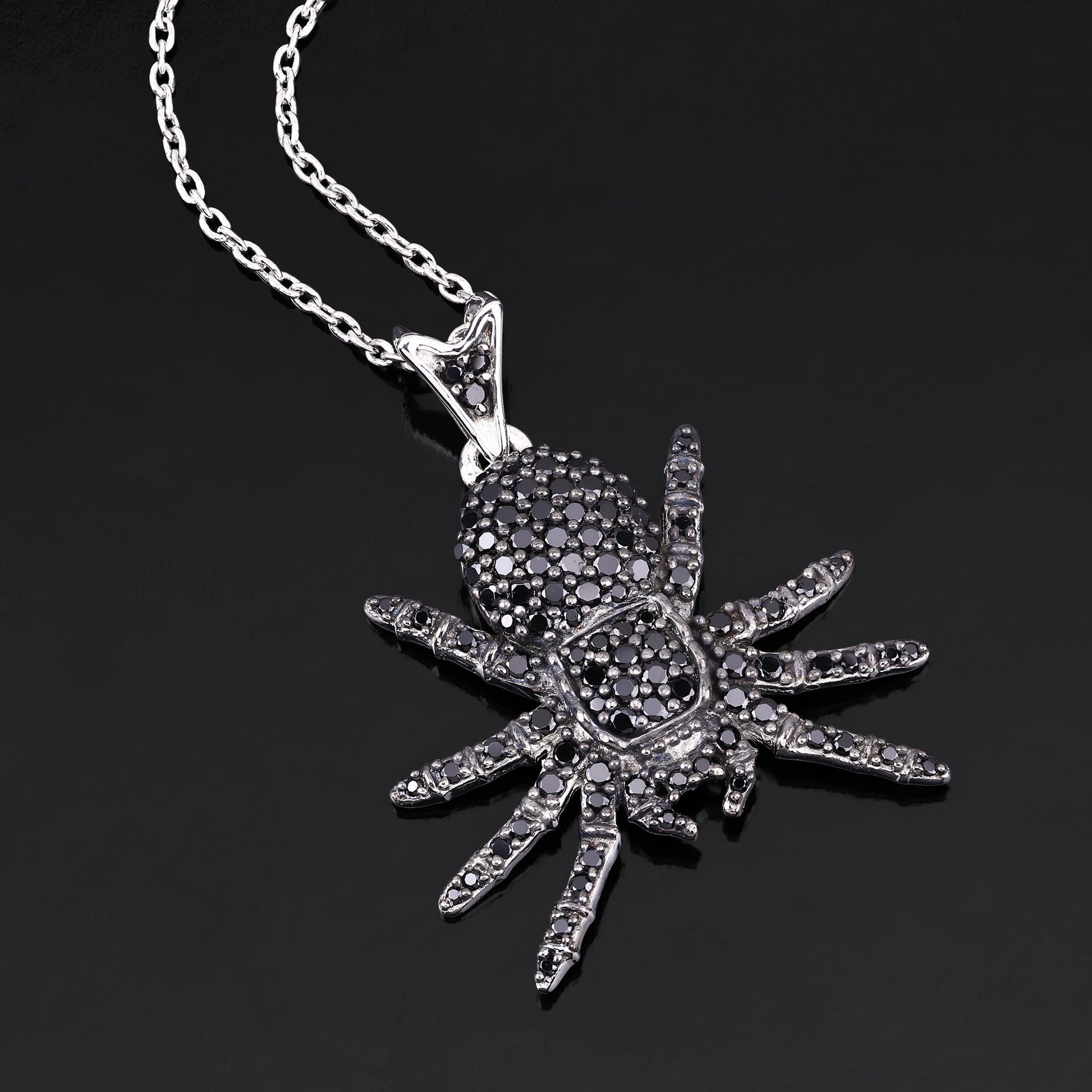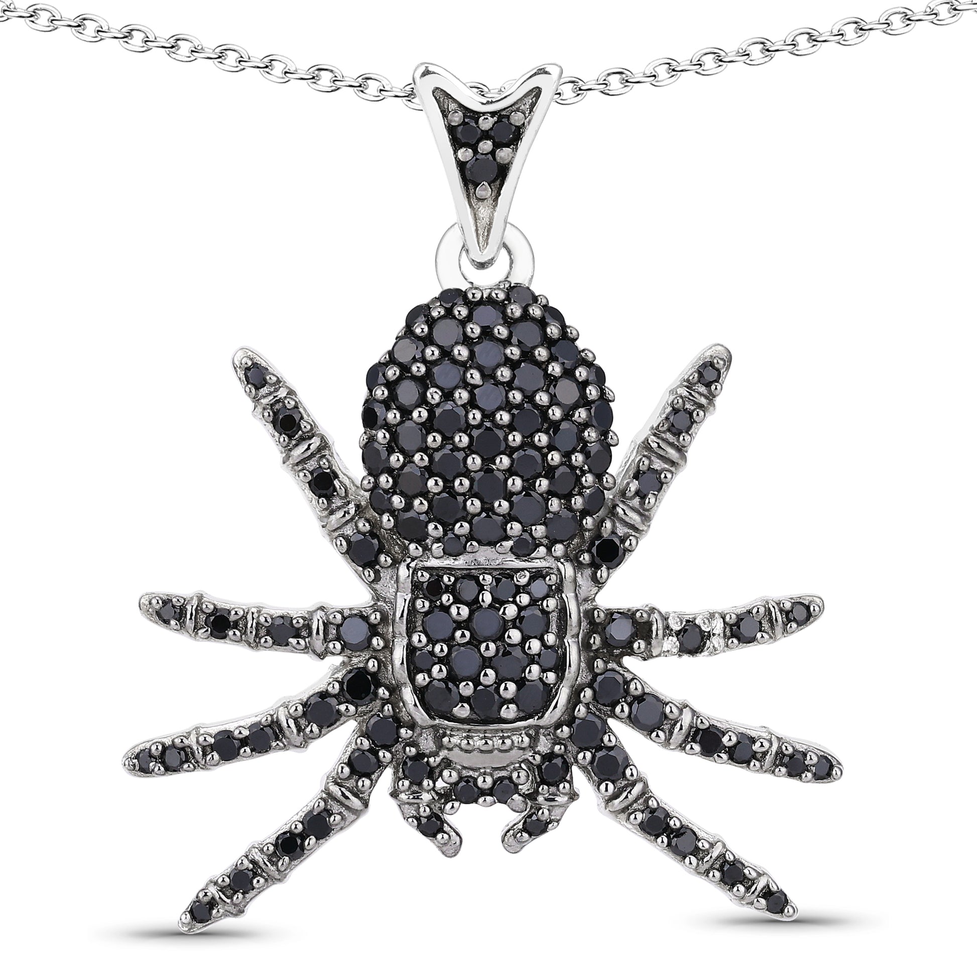 Unleash your daring style with this unique Spider Pendant, crafted in .925 sterling silver with a sleek platinum plating for a luxurious finish. The intricate design features black spinel stones encrusted throughout the spider’s body and legs, creating a striking and bold look. Hanging from an 18-inch chain, this pendant adds a touch of dark elegance to any outfit, perfect for making a statement.