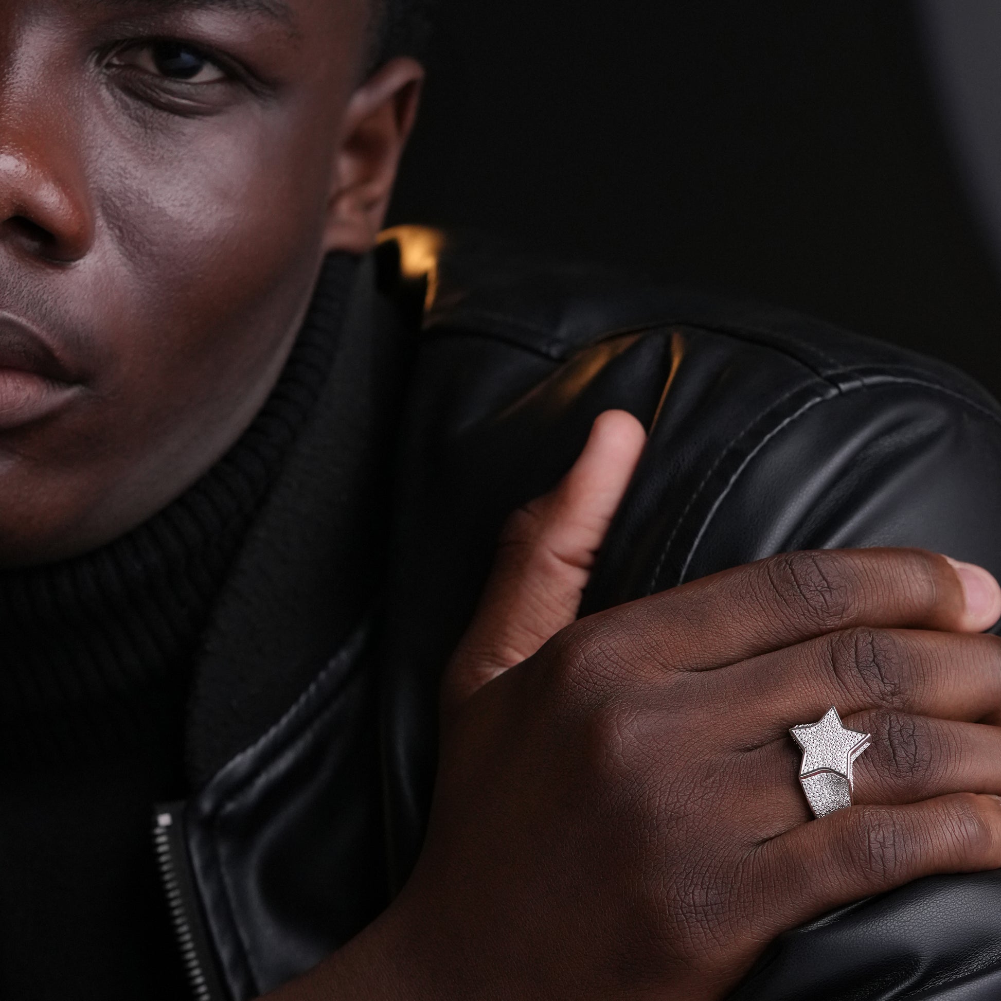 Make a bold statement with the eye-catching Star Ring, crafted in .925 sterling silver with a sleek platinum plating. The star-shaped design is intricately paved with simulated diamonds, creating a stunning sparkle that captures the light beautifully.