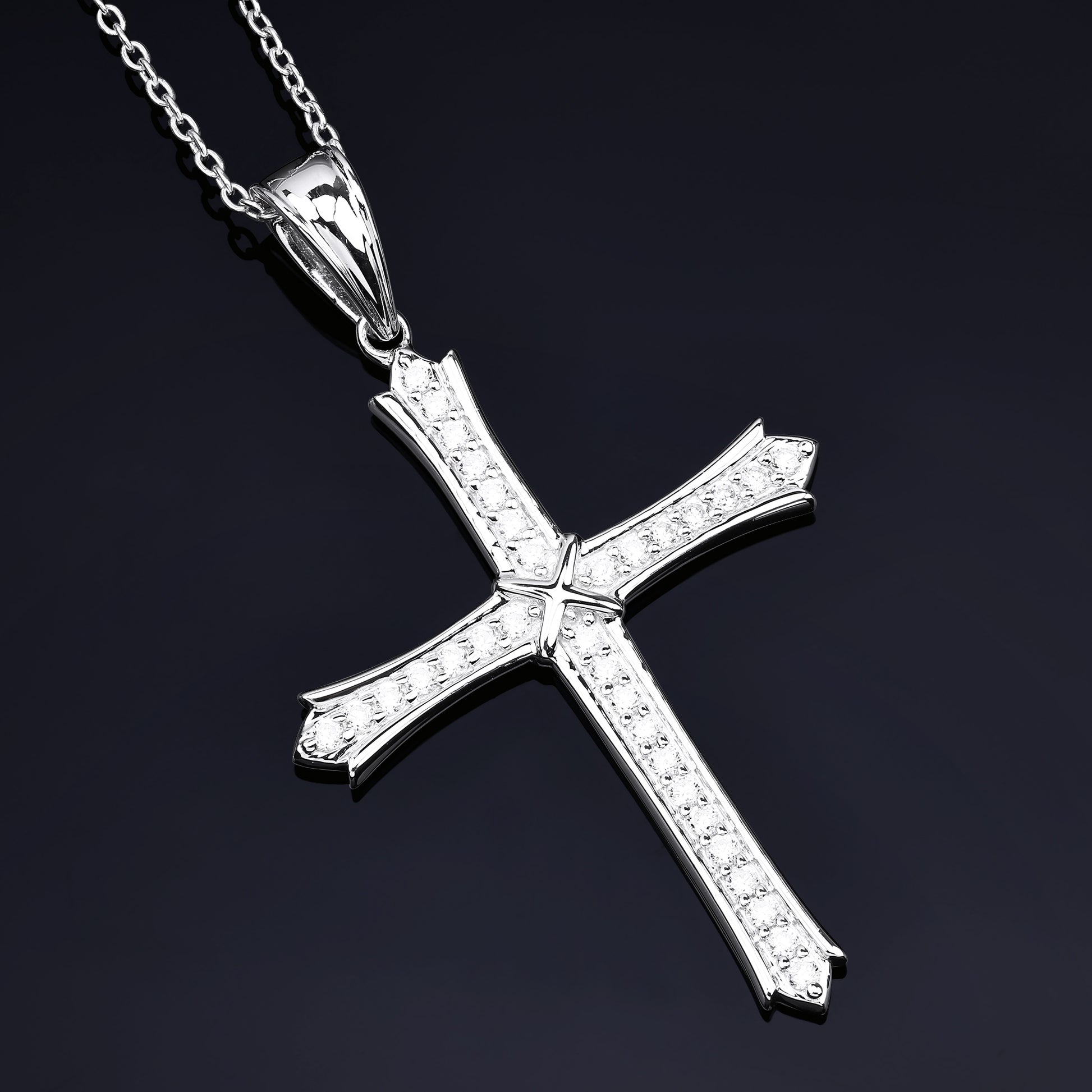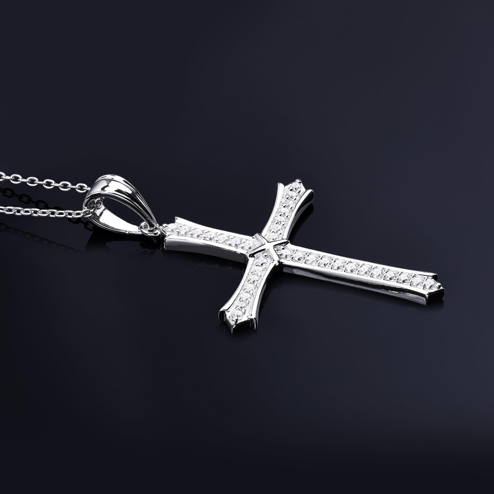 Embrace classic beauty with this exquisite Cross Pendant. Made from high-quality .925 sterling silver and finished with platinum plating, it offers a brilliant, tarnish-resistant shine. The pendant features 33 round VVS diamond simulant stones (1.50mm), arranged in a striking three-row design that adds a touch of elegance to the traditional cross silhouette. Hanging from an 18-inch chain.